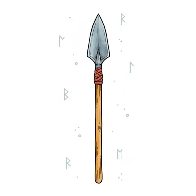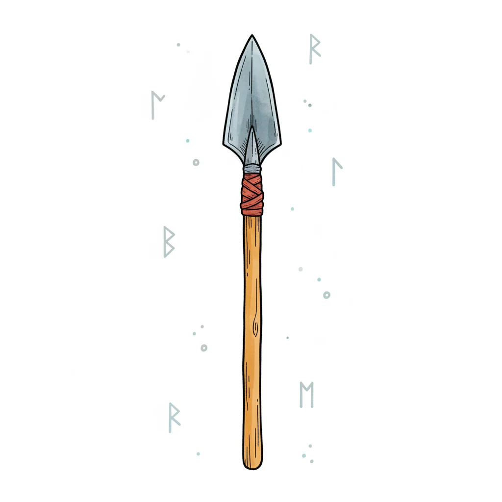 Gezeichneter Speer mit Metallspitze, Holzschaft und roter Wicklung auf weißem Grund mit Runen.