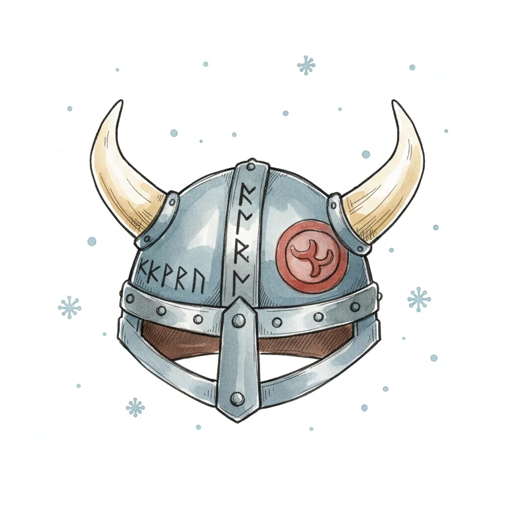 Illustrierter Wikingerhelm mit Hörnern, Runen und rotem Symbol, umgeben von Schneeflocken.