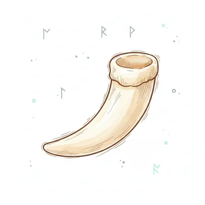 Handgezeichnetes Trinkhorn in hellem Ton, umgeben von Runen und Punkten im skizzenhaften Stil.
