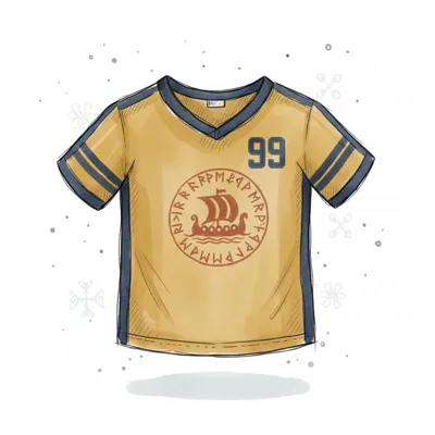 Skizze eines gelben T-Shirts mit Wikingerschiff-Emblem, Runen und der Nummer 99.