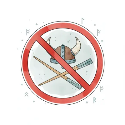 Verbotsschild mit Wikingerhelm und gekreuzten Essstäbchen, umgeben von Runen.