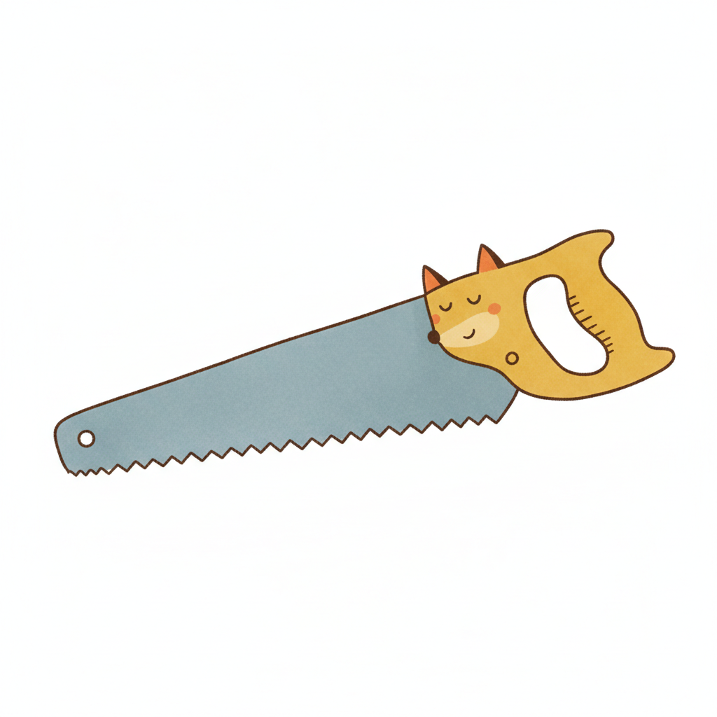 Eine niedliche Cartoon-Handsäge mit einem Fuchskopf als Griff auf weißem Hintergrund.