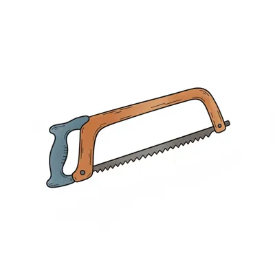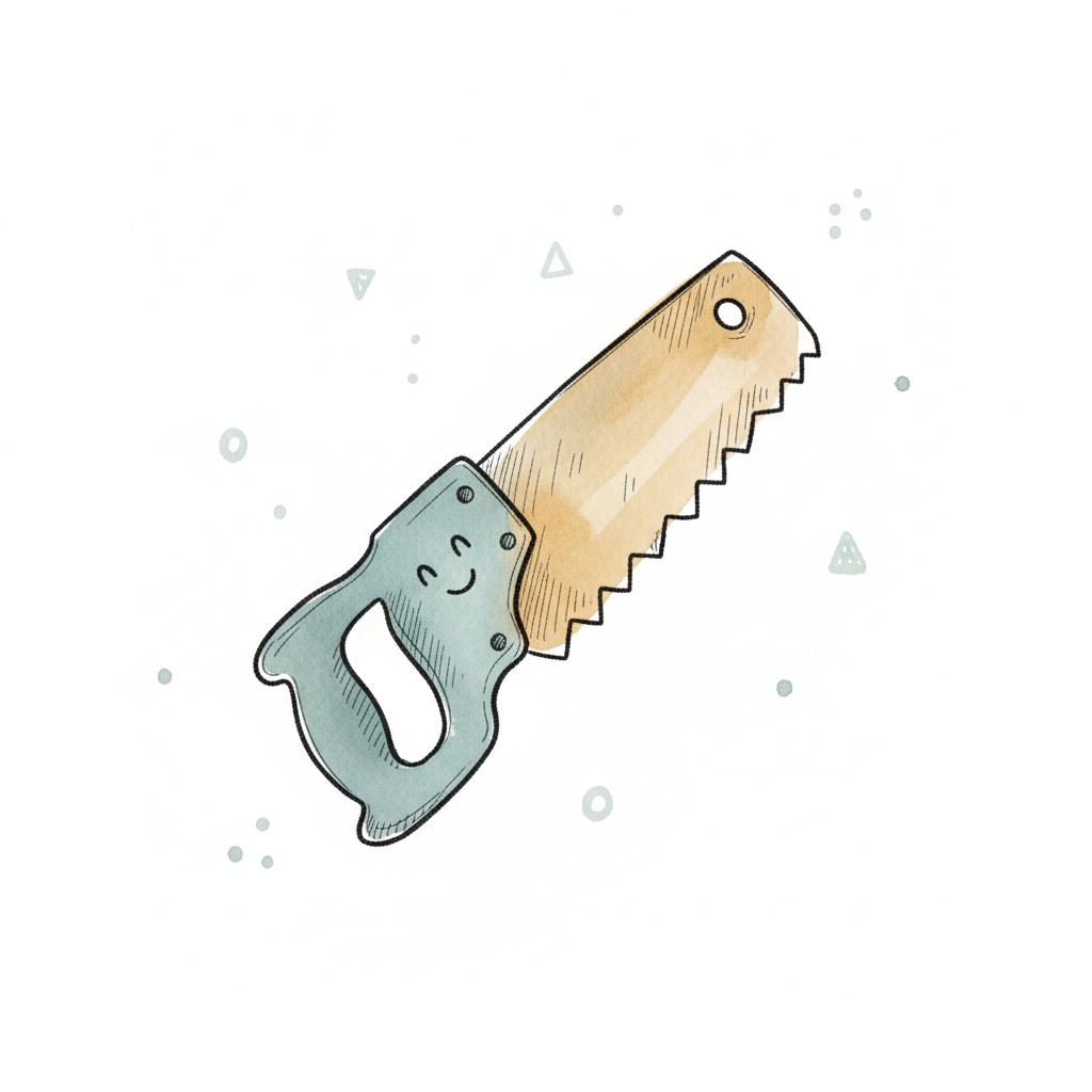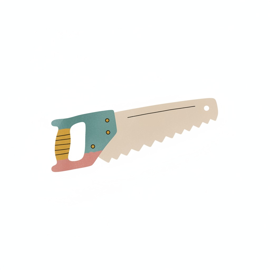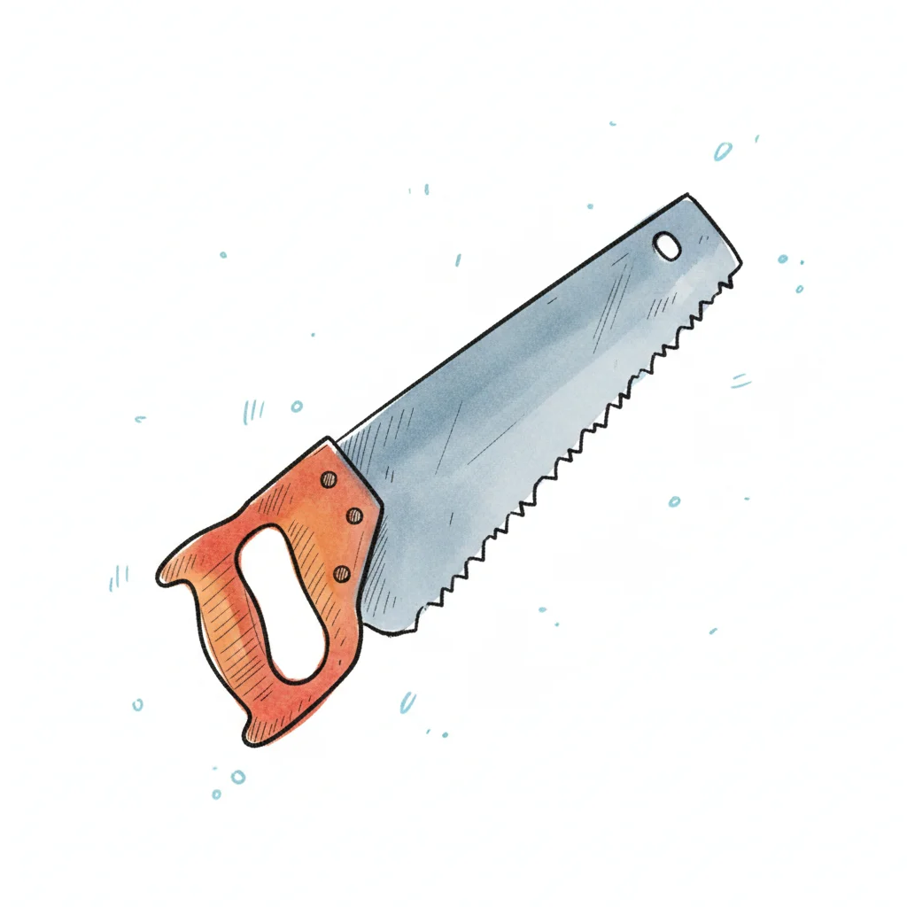 Illustration einer Handsäge mit Holzgriff und gezacktem Metallblatt auf weißem Hintergrund.
