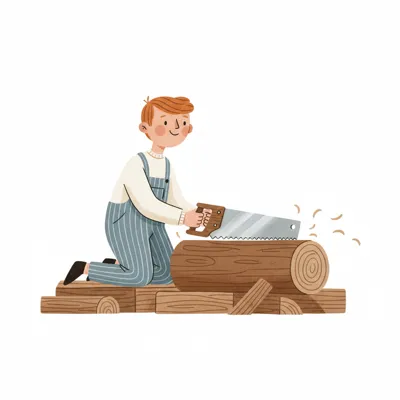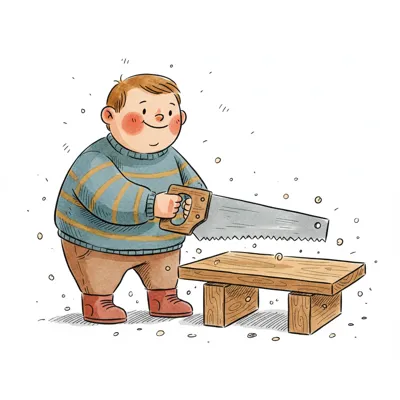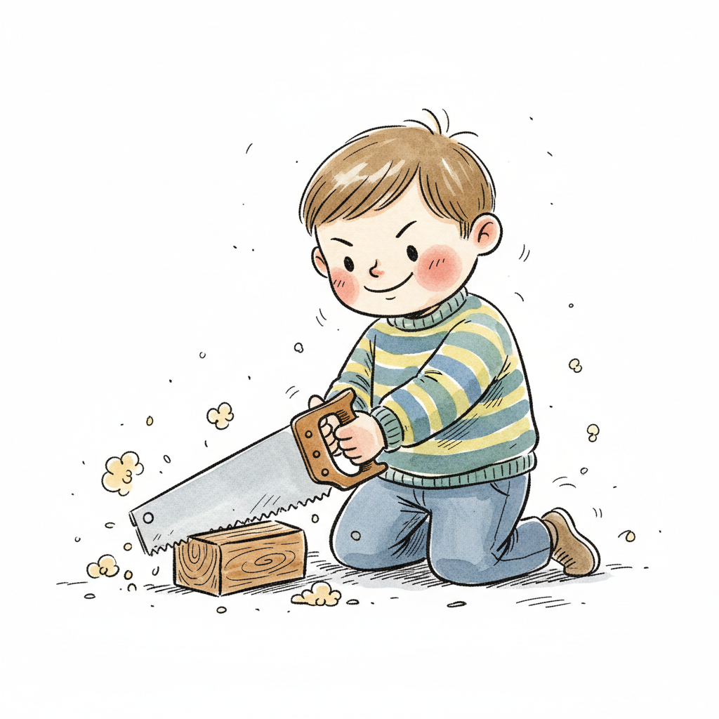 Ein lächelnder Cartoon-Junge sägt ein Holzbrett, umgeben von Spänen.