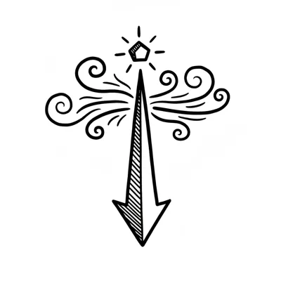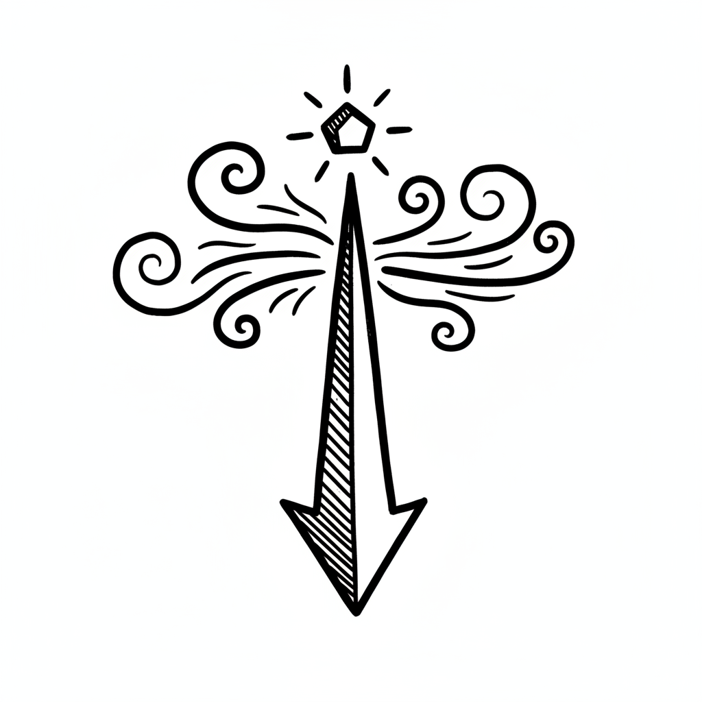Handgezeichneter Pfeil nach unten mit leuchtendem Stern und dekorativen Wirbeln.