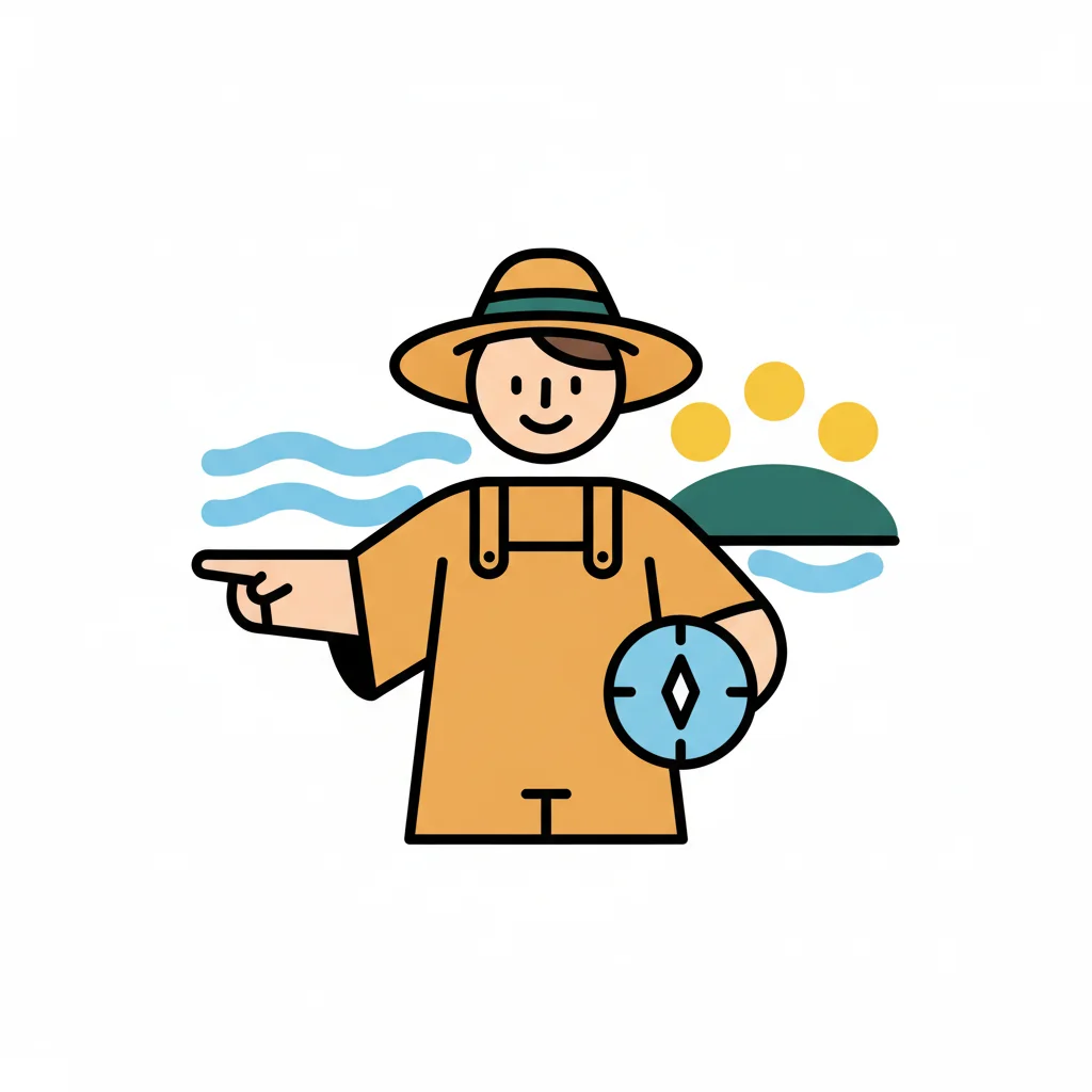 Illustrierter Reisender mit Hut und Kompass zeigt den Weg, umgeben von Wasser und Hügeln.