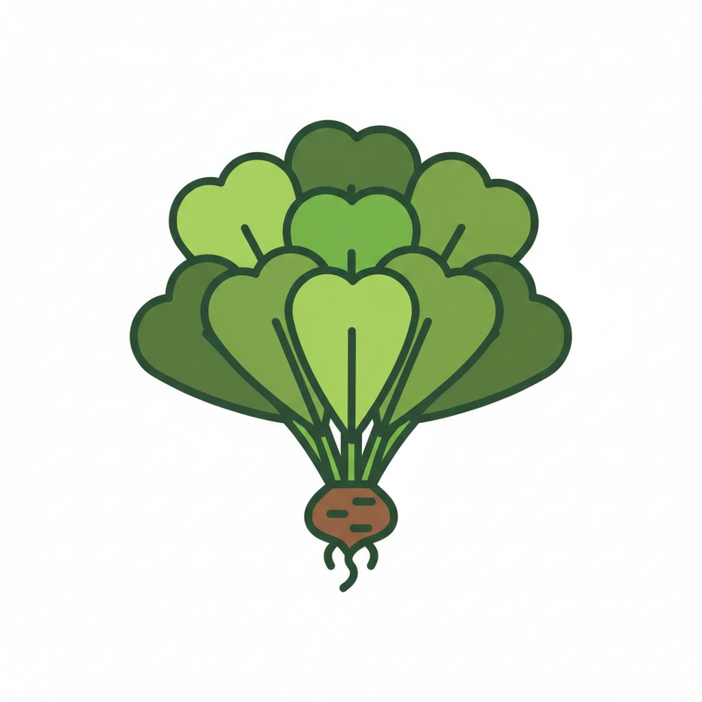 Buntes, stilisiertes Gemüse mit grünen und rosa Blättern.