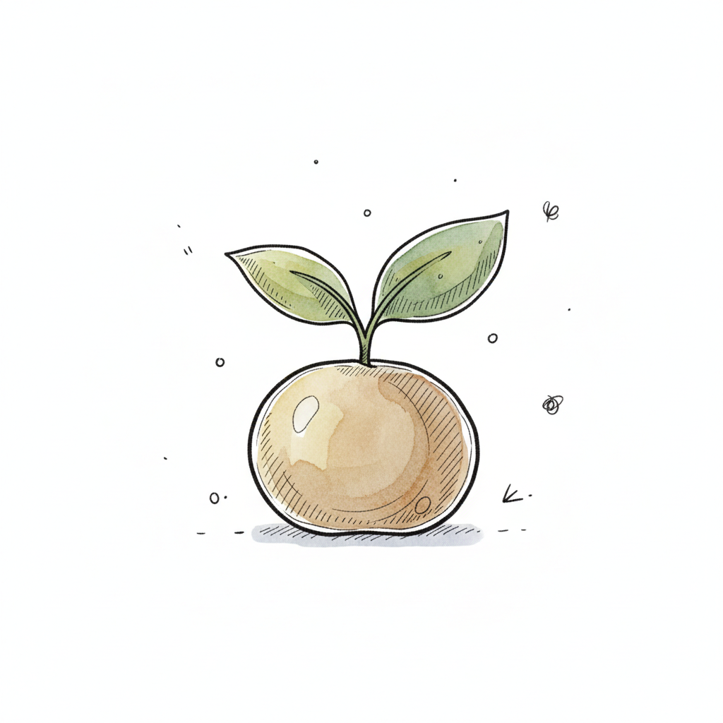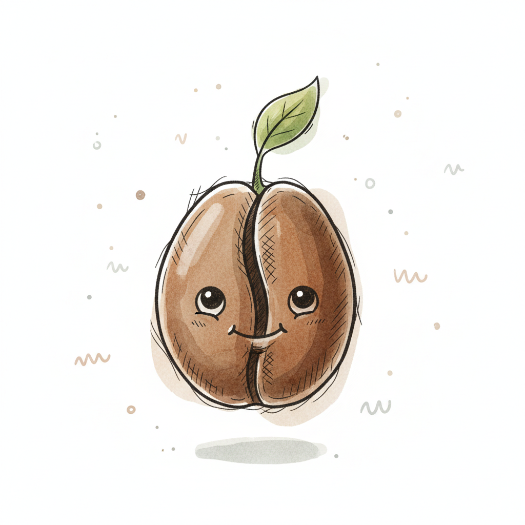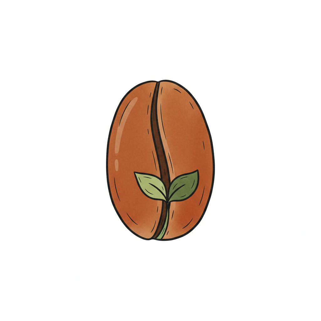 Illustration einer Kaffeebohne, aus der ein kleiner grüner Keimling sprießt.