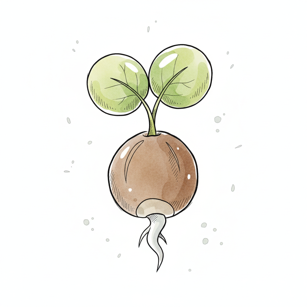 Niedliche Illustration einer keimenden Pflanze mit zwei Blättern, braunem Samen und Wurzeln.