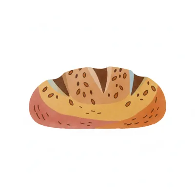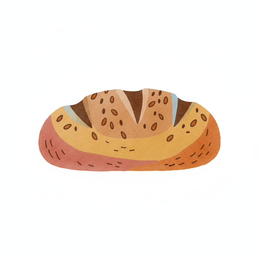 Ein illustrierter Brotlaib mit Samen und Einschnitten in warmen Farbtönen auf weißem Grund.