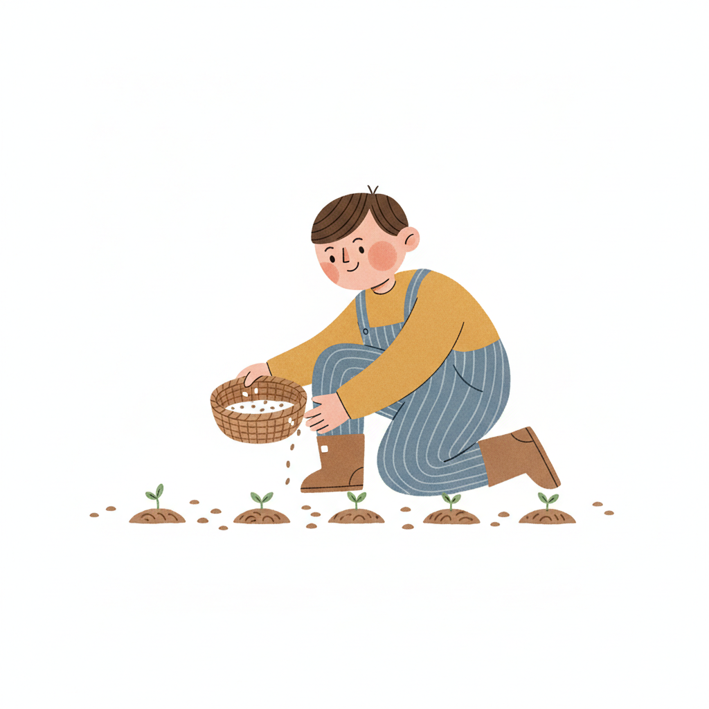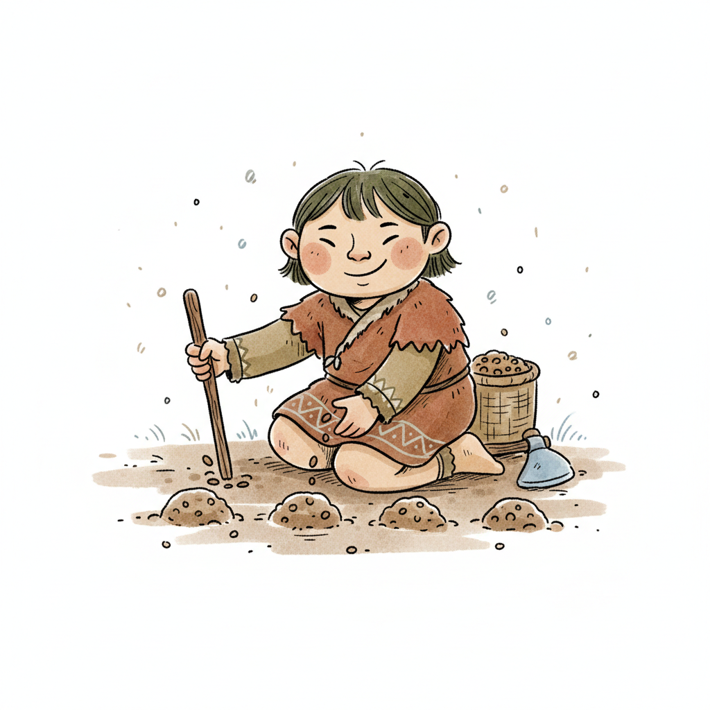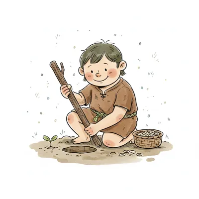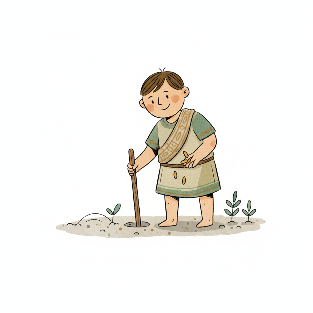 Ein lächelndes Kind in einfacher Kleidung pflanzt Samen in die Erde, mit einem Korb voller Saatgut.