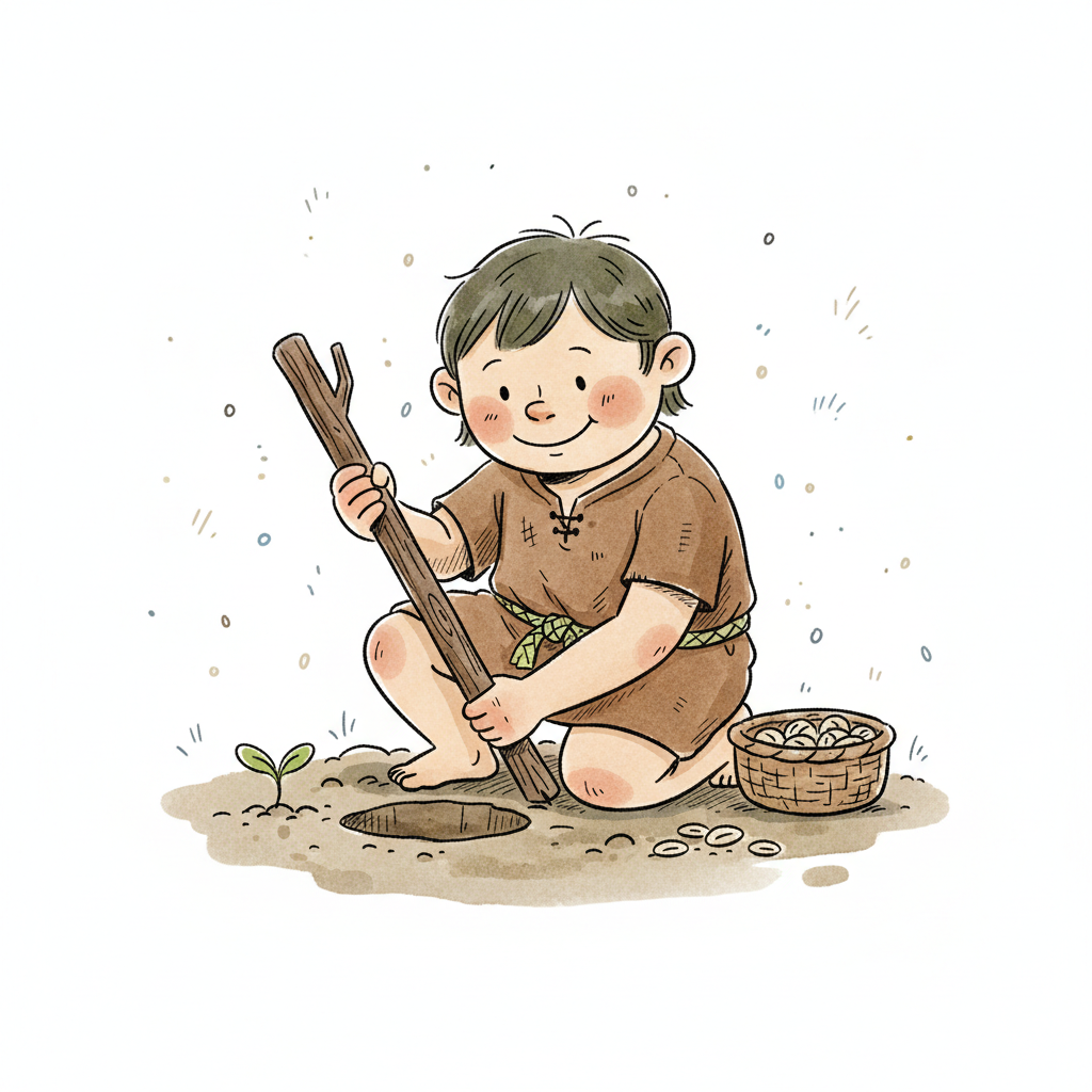Ein lächelnder Junge pflanzt Samen mit einem Stock in die Erde, umgeben von kleinen Pflanzen.