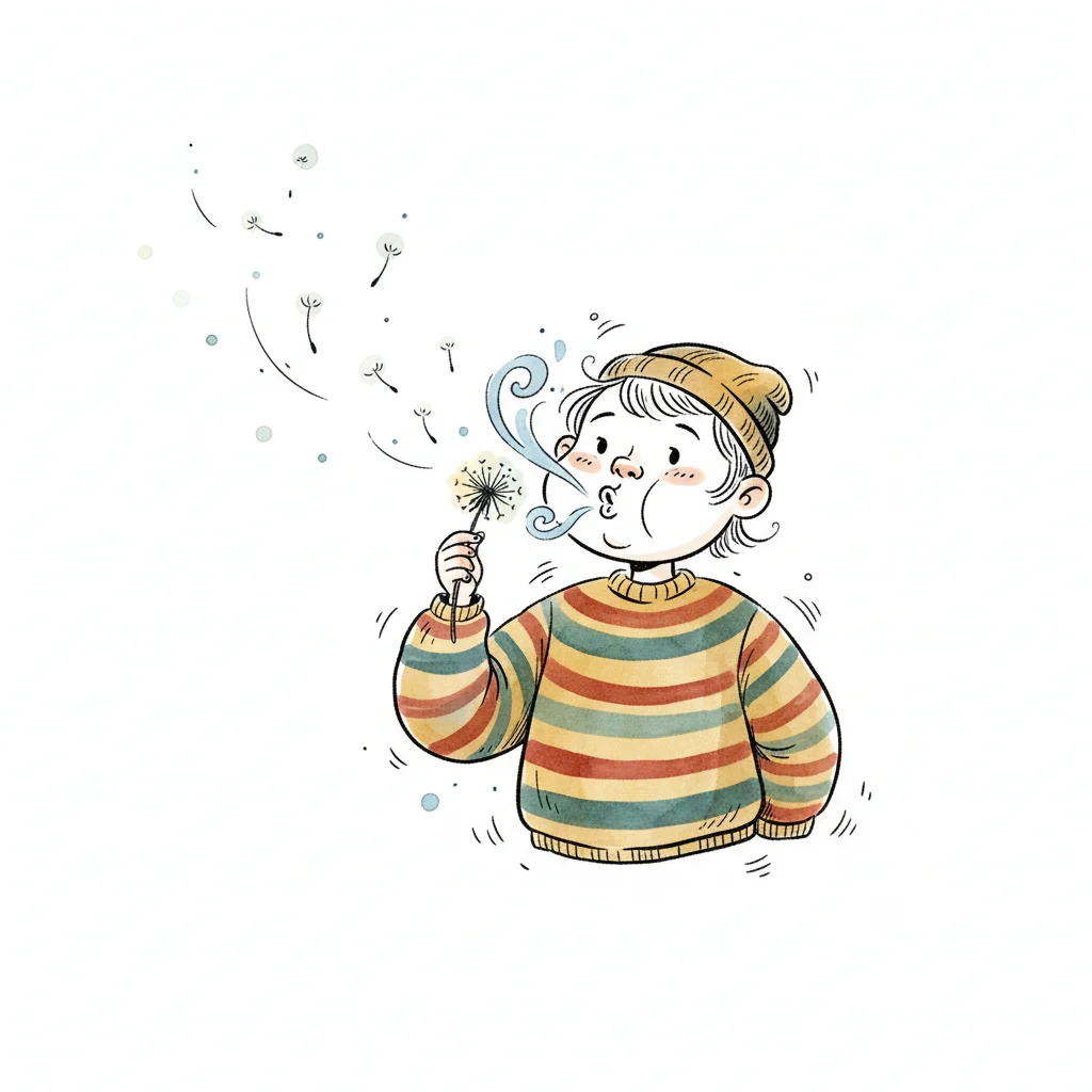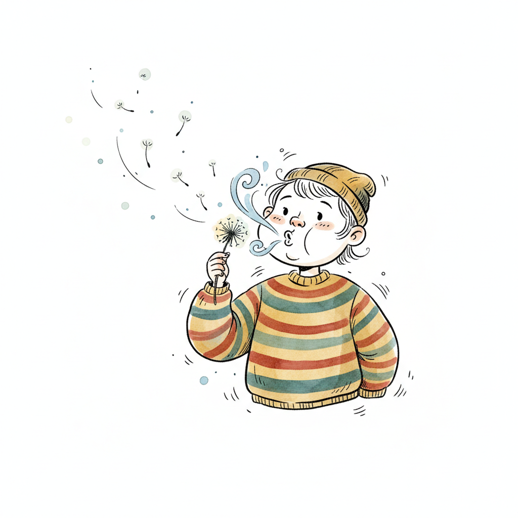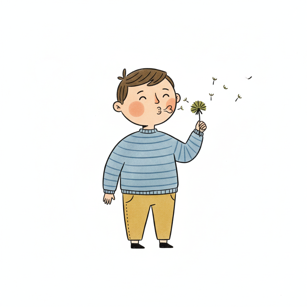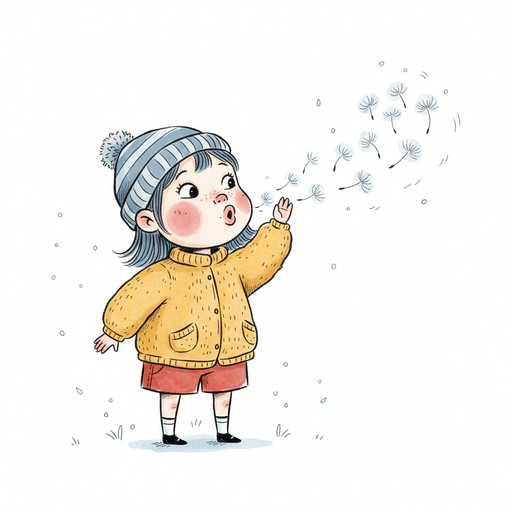 Niedliche Illustration eines Kindes, das eine Pusteblume bläst, deren Samen davonfliegen.