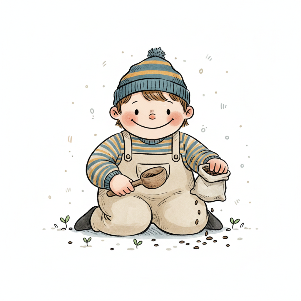 Ein lächelndes Kind in Mütze und Latzhose pflanzt Samen mit einem Löffel.