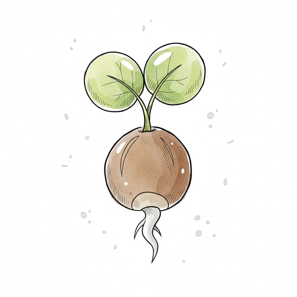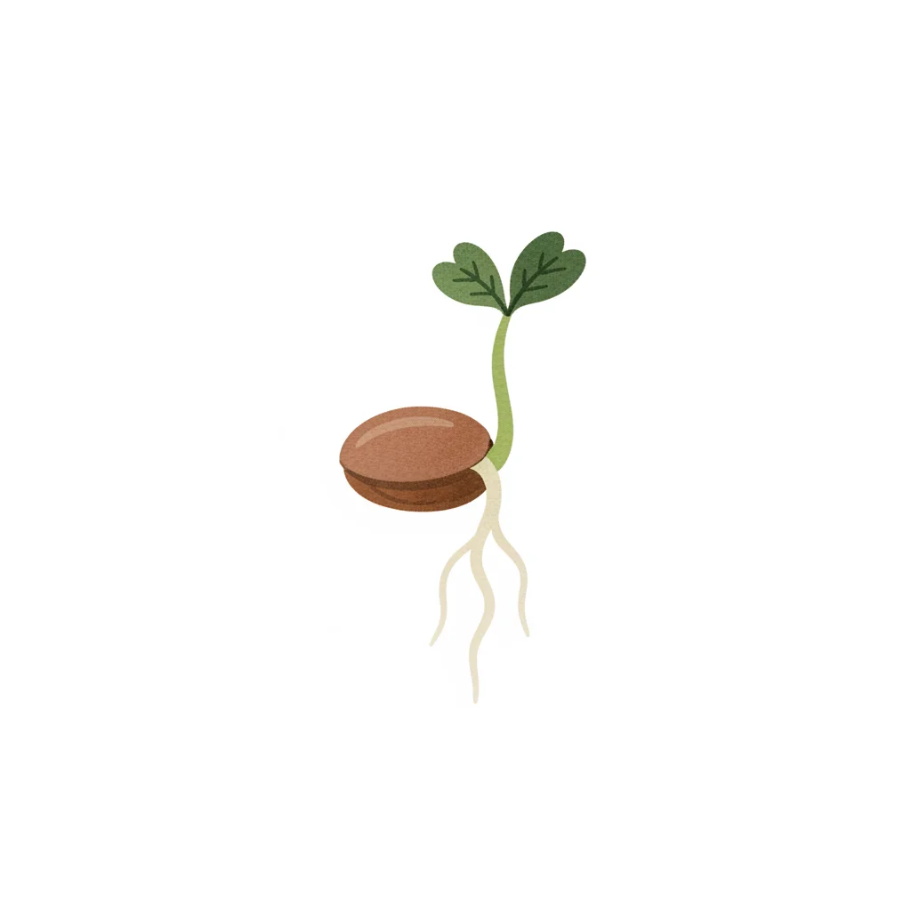Illustration einer keimenden Pflanze mit Samen, Wurzeln und zwei kleinen Blättern auf weißem Hintergrund.