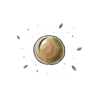Aquarell-Illustration einer runden, braun-grünen Frucht mit kleinen Blättern und Punkten.