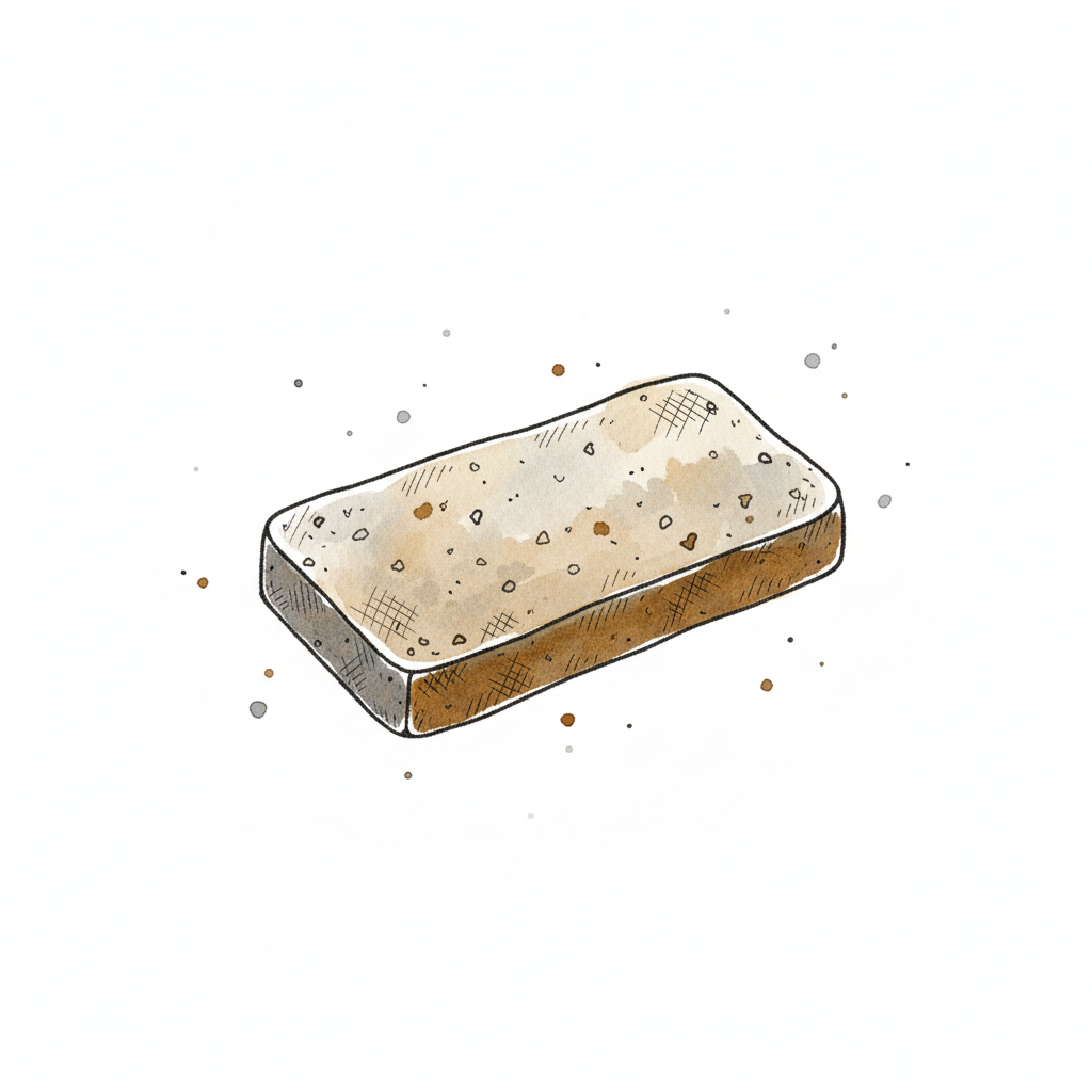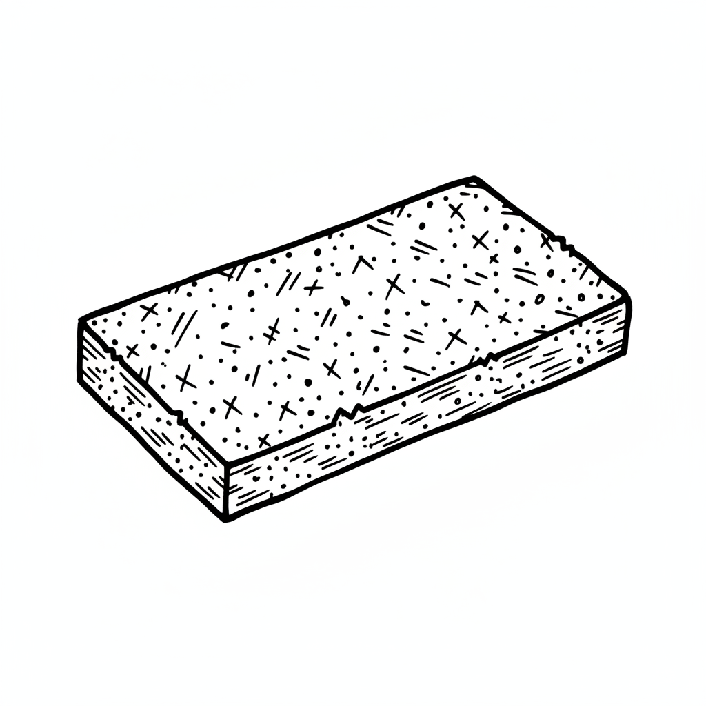 Schwarz-weiße Strichzeichnung eines rechteckigen, strukturierten Objekts, wie ein Schwamm oder Baustoff.