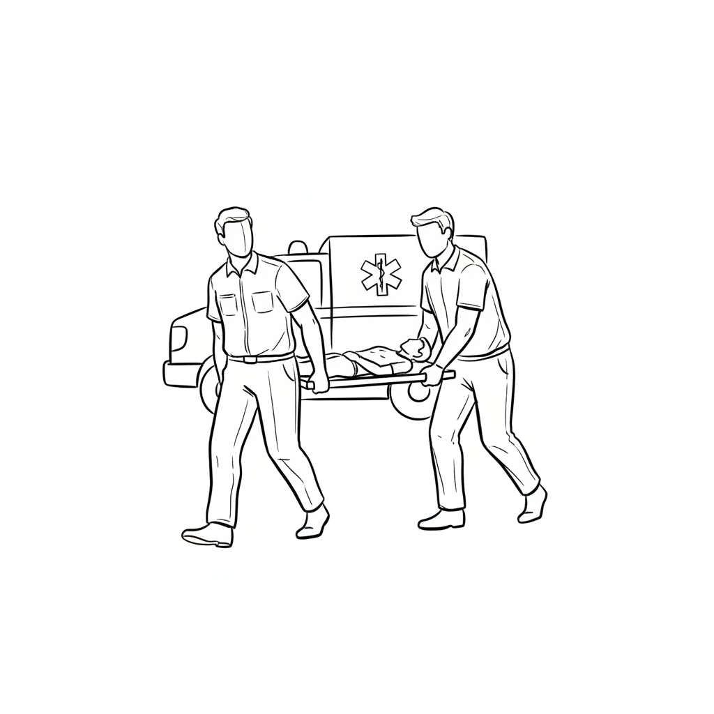 Zwei Sanitäter tragen eine Person auf einer Trage zum Krankenwagen. Strichzeichnung.