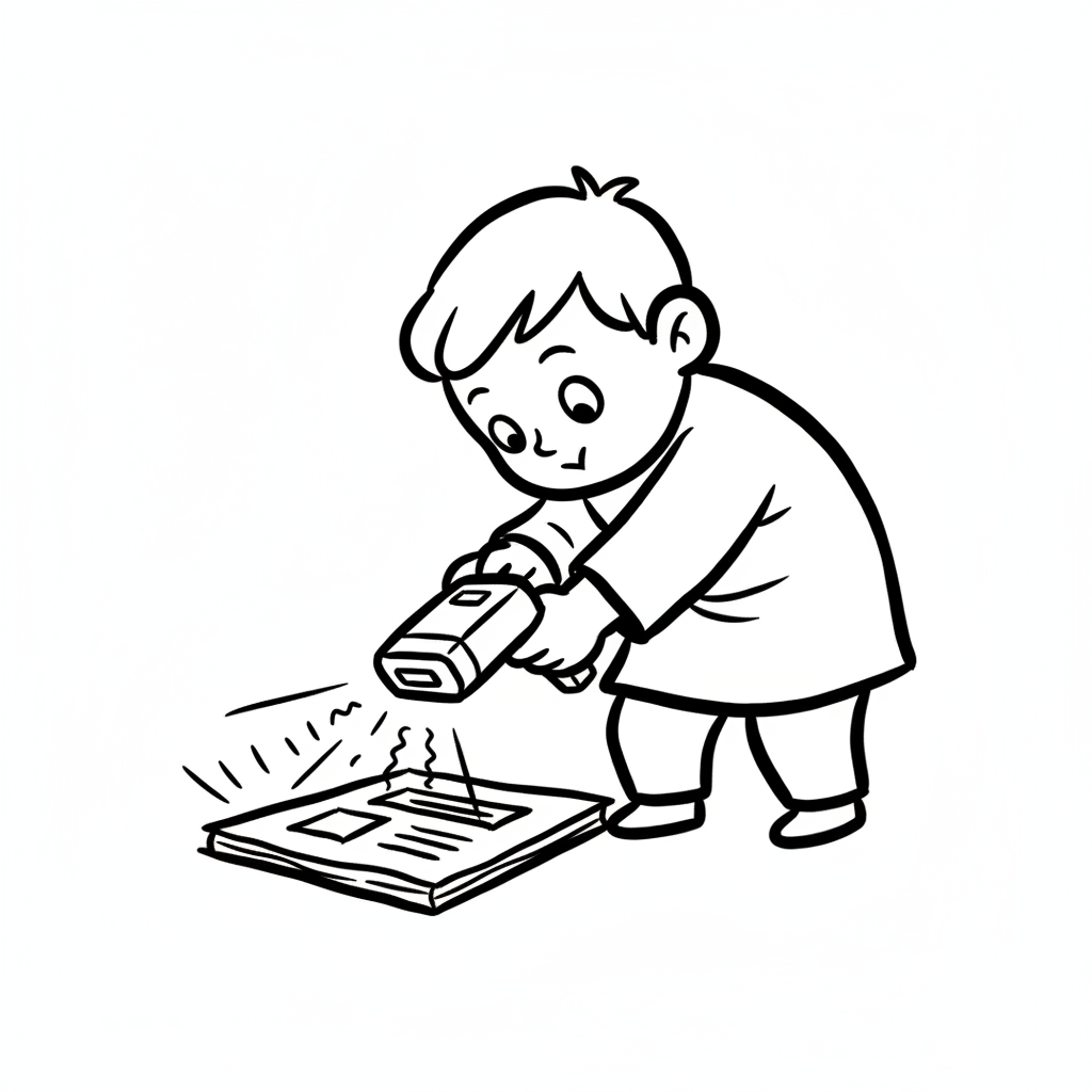 Schwarz-Weiß-Zeichnung eines Jungen, der ein Buch mit einem Handscanner scannt.