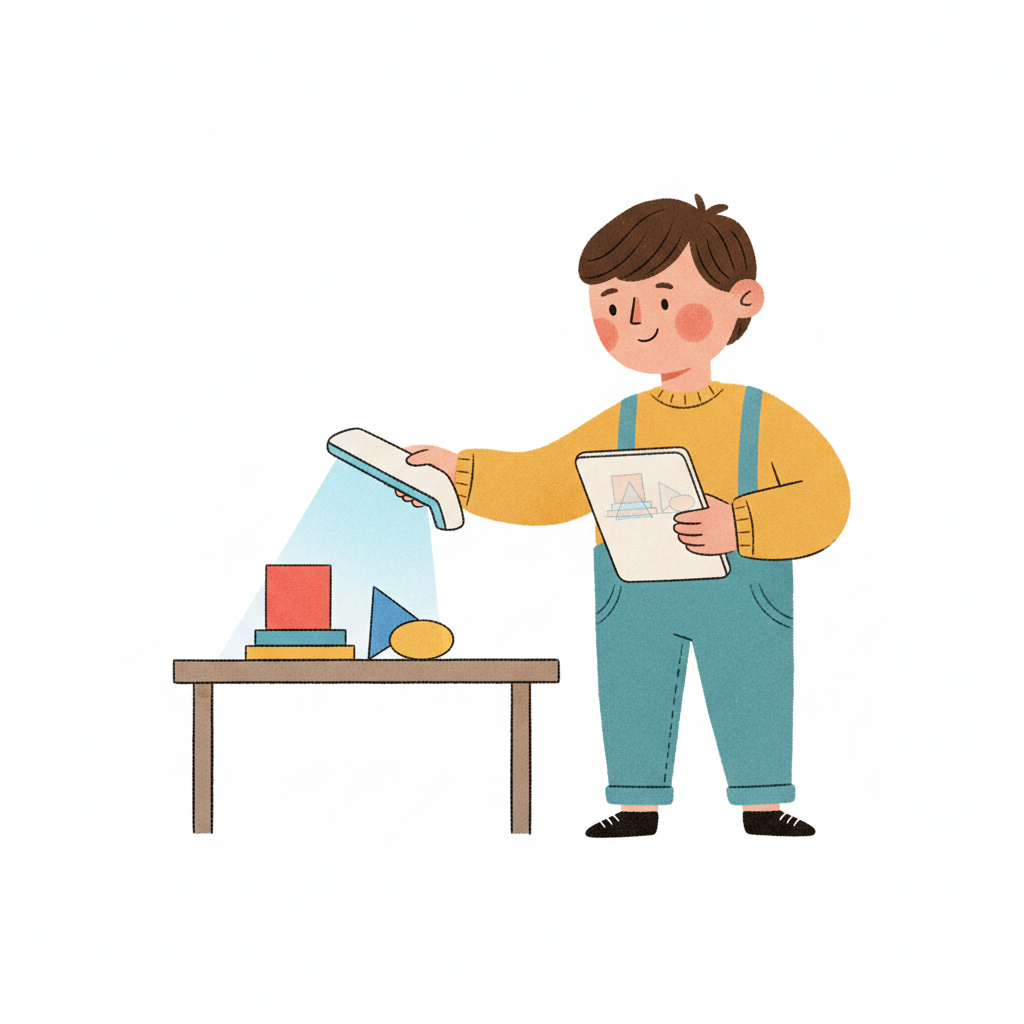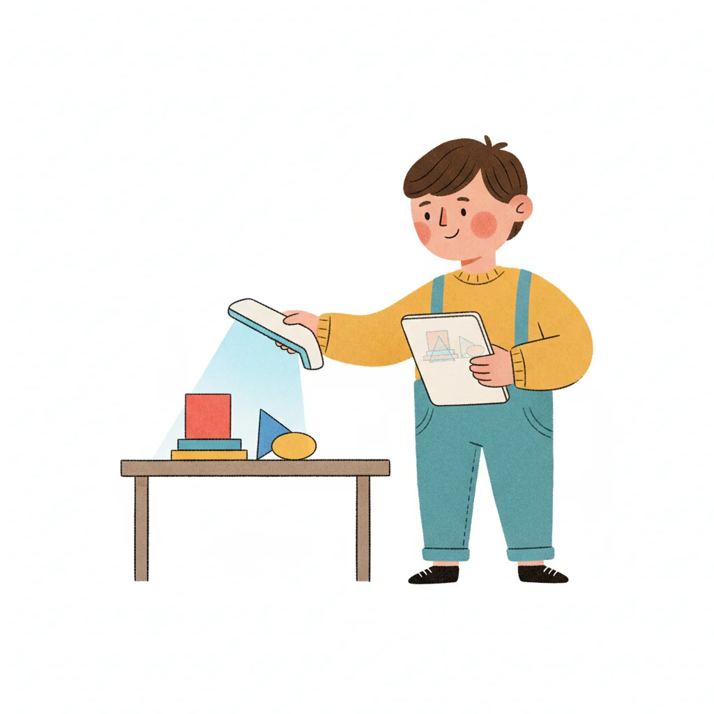 Junge beleuchtet geometrische Formen auf einem Tisch und hält ein Klemmbrett.