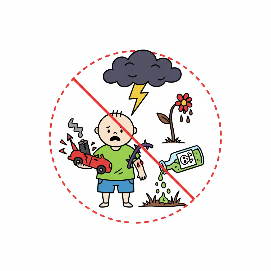 Warnung vor Gefahren für Kinder: Blitz, Gift, Verletzungen, kaputtes Spielzeug. Alles verboten.