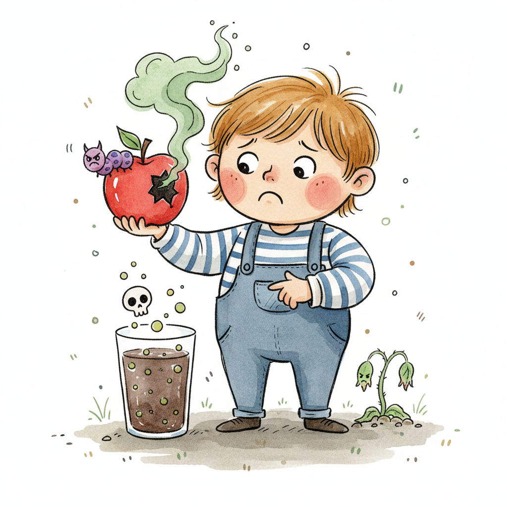 Ein trauriger Junge hält einen faulen Apfel; daneben ein giftiges Getränk und eine welke Pflanze.
