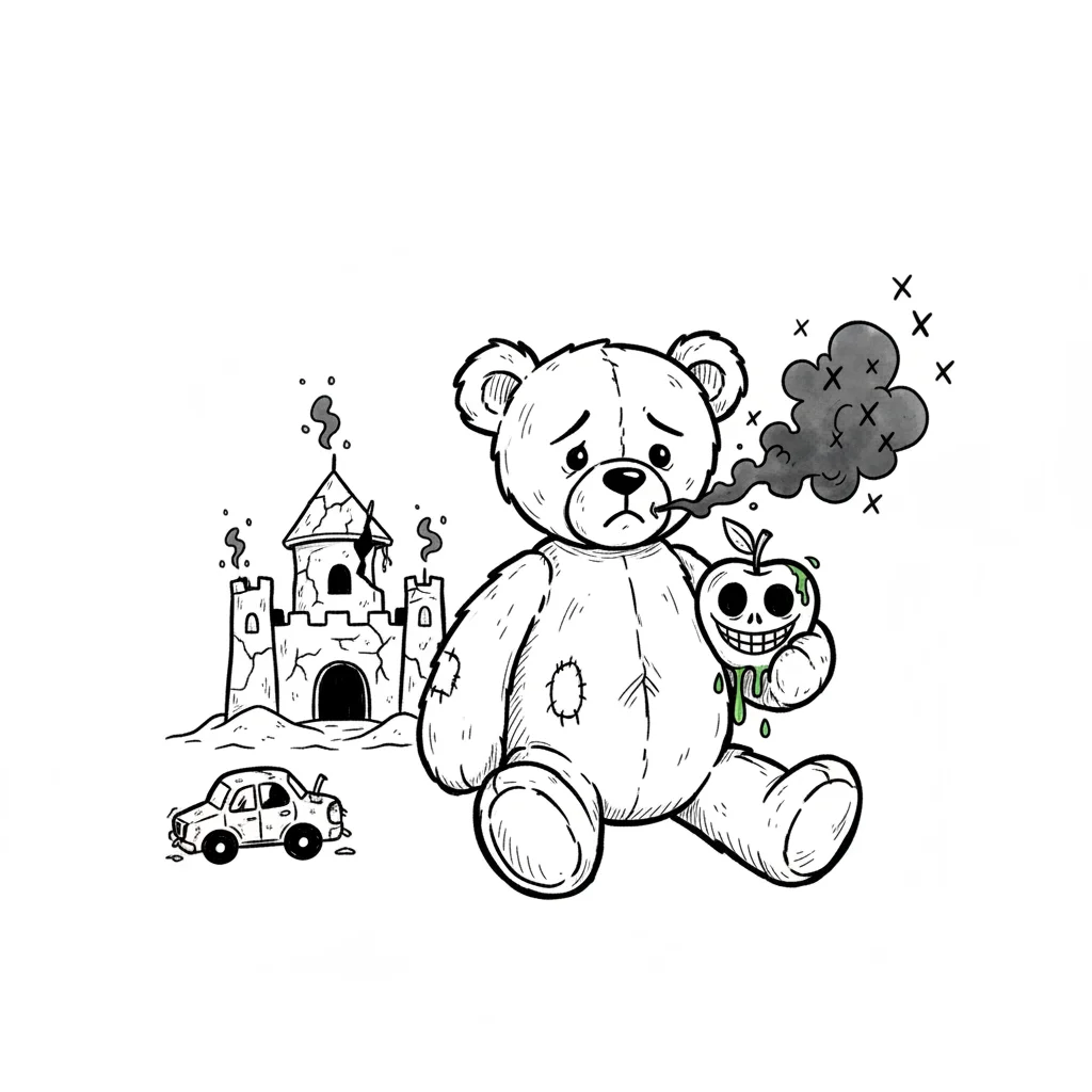 Trauriger Teddybär raucht, hält giftigen Apfel. Im Hintergrund: zerfallenes Schloss, kaputtes Auto.