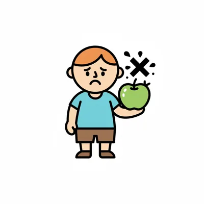 Ein trauriger Junge hält einen Apfel, der mit einem X als abgelehnt markiert ist.