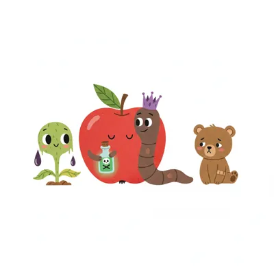 Niedliche Cartoon-Figuren: Pflanze, Apfel mit Giftflasche, Wurm mit Krone, trauriger Bär.