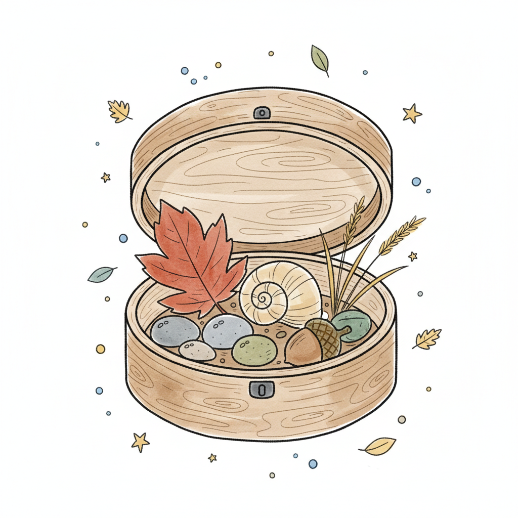Offene Holzkiste gefüllt mit Herbstschätzen: Ahornblatt, Schneckenhaus, Kieselsteine, Eicheln, Gräser.