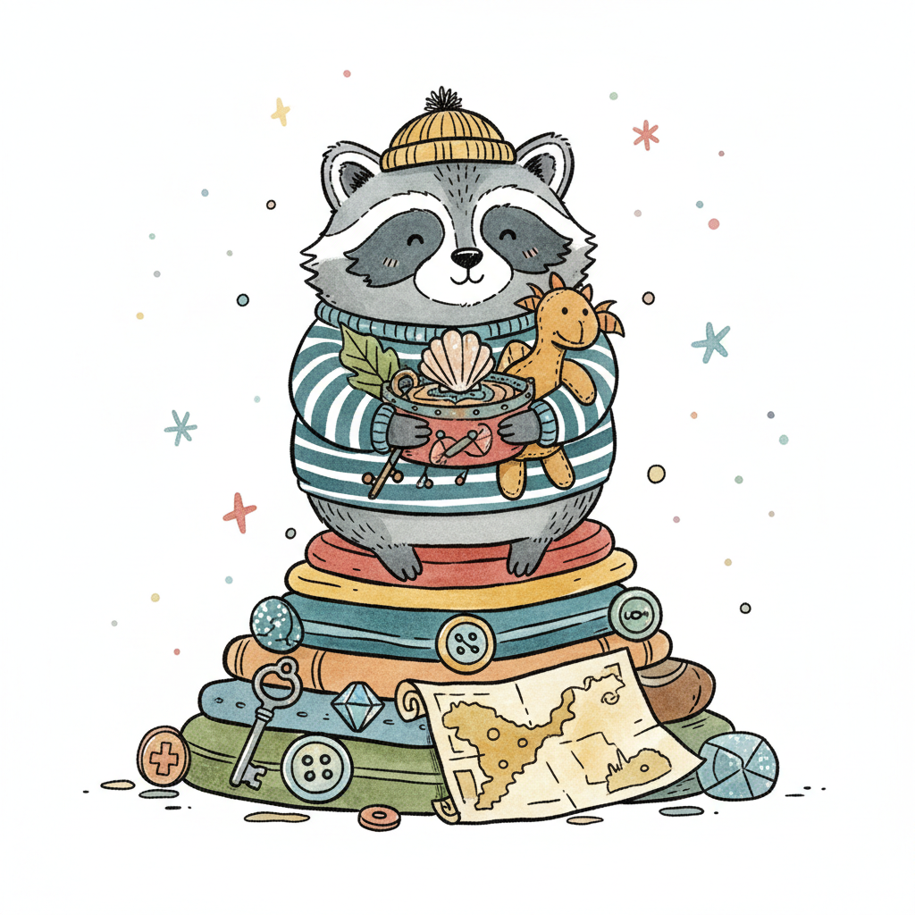 Illustration eines Waschbären in Mütze und Pullover, der auf Büchern mit Schätzen sitzt.