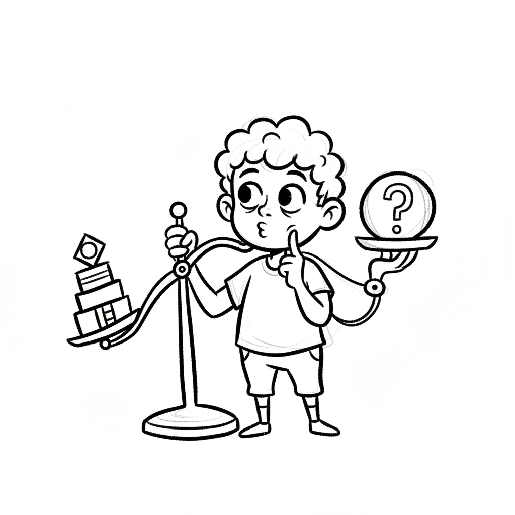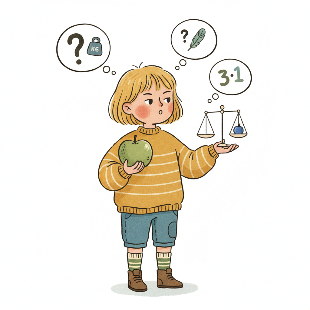 Cartoon-Kind mit Apfel und Waage, das über Gewicht und Messung nachdenkt.