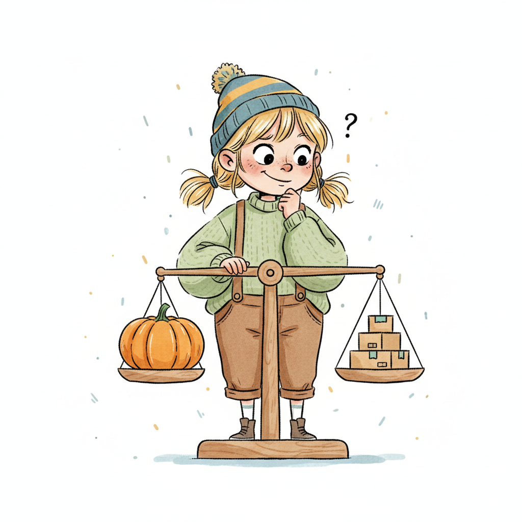 Ein Mädchen mit Mütze vergleicht einen Kürbis mit Kartons auf einer Waage und denkt nach.