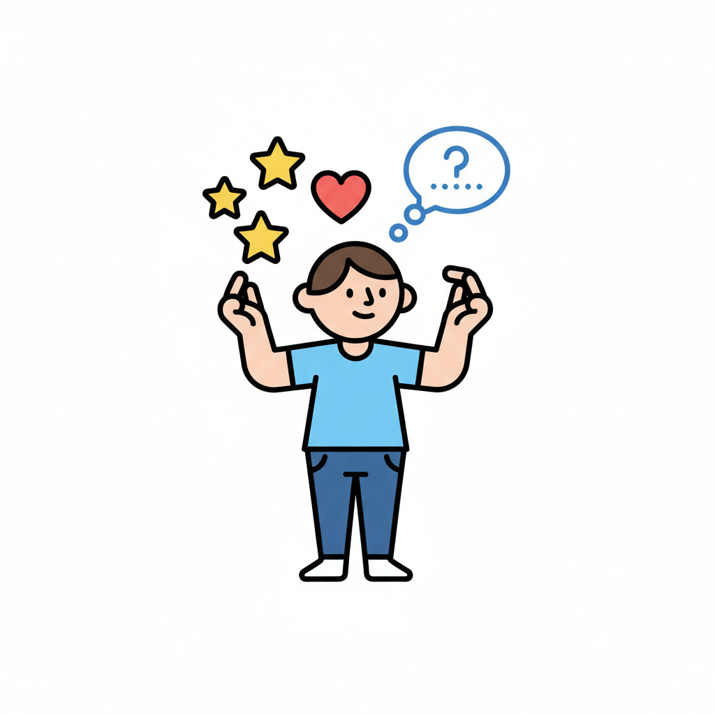 Cartoonfigur überlegt mit Sternen, Herz und Fragezeichen über dem Kopf, die Hände gestikulierend.