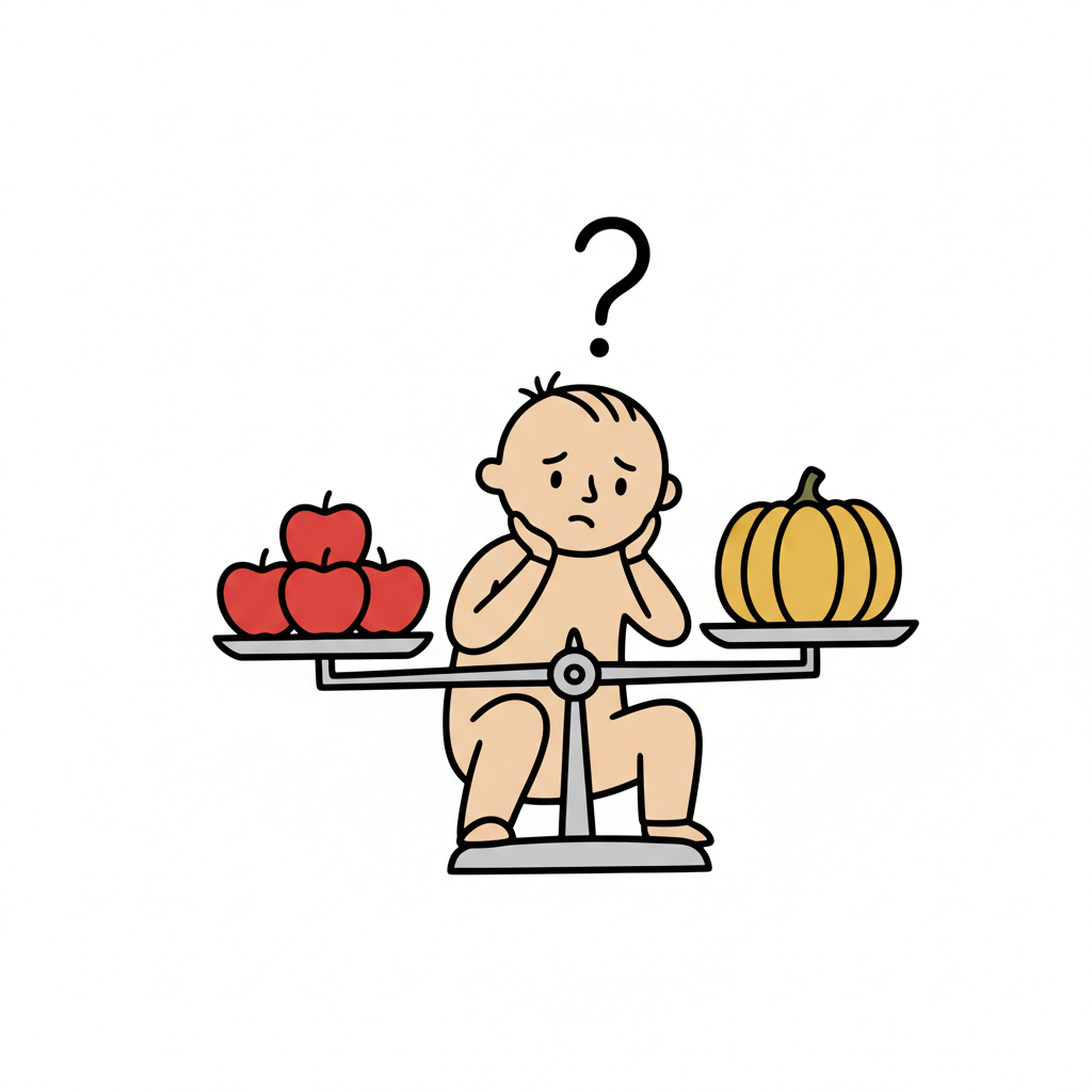 Baby auf Waage mit Äpfeln und Kürbis, fragt sich, was schwerer ist.