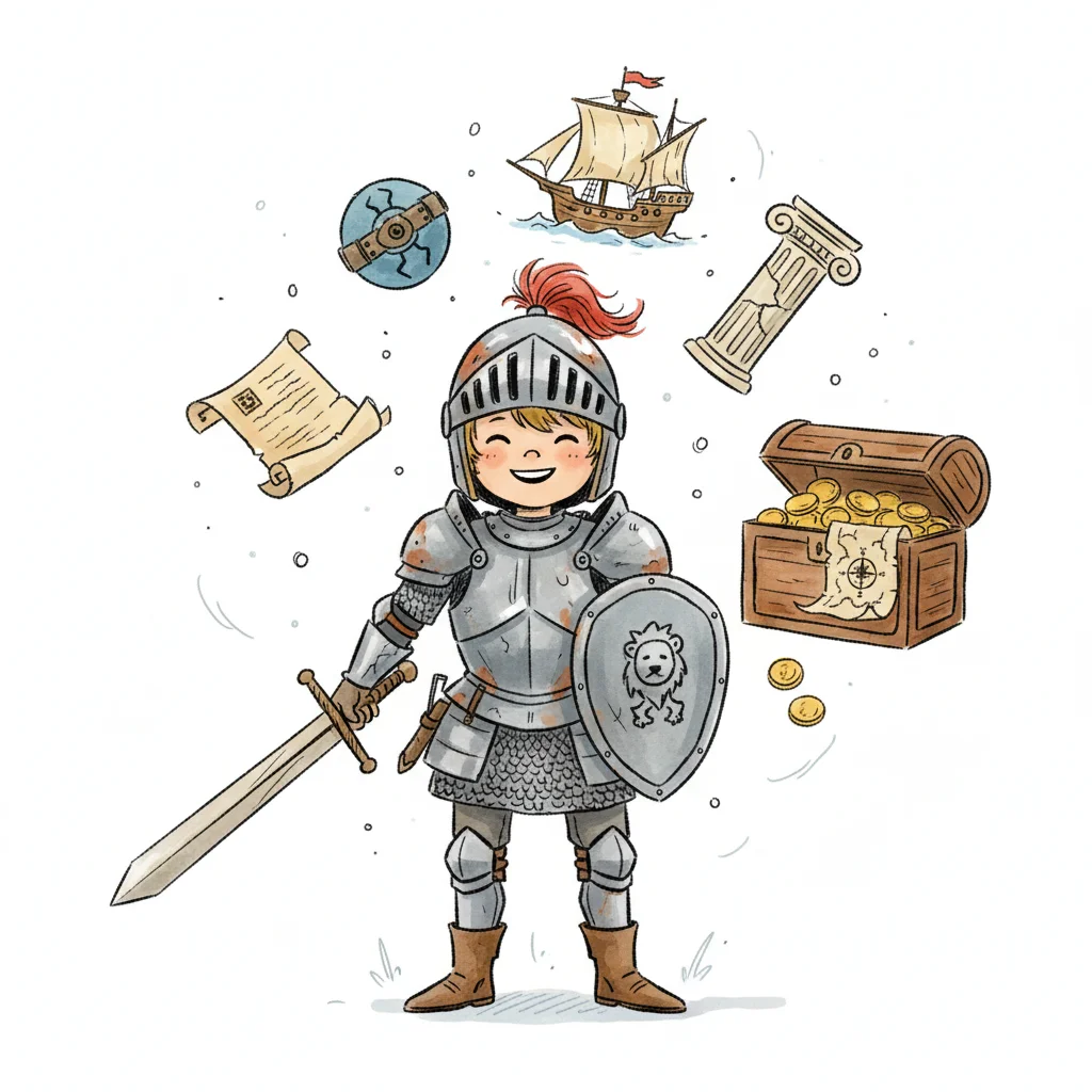 Fröhliches Kind in Ritterrüstung mit Schwert und Schild, umgeben von Schätzen und Abenteuer-Symbolen.
