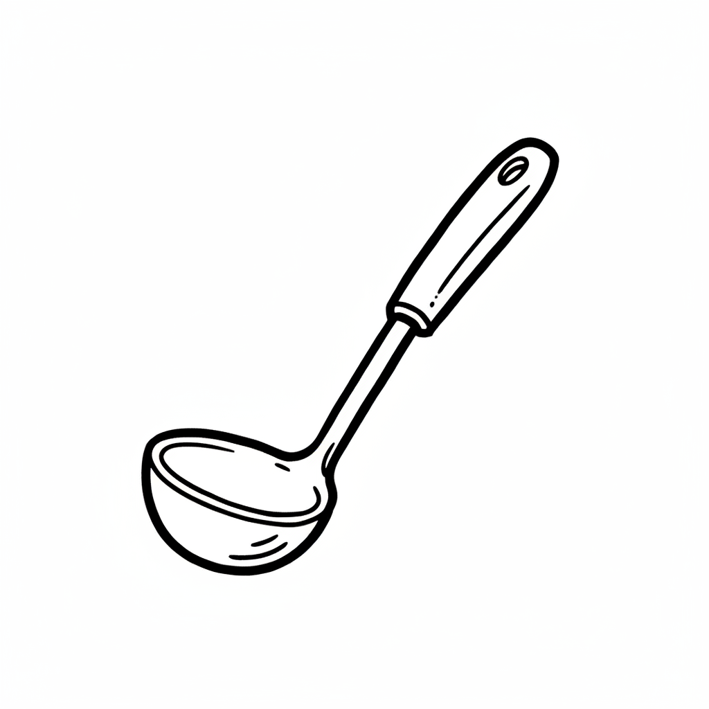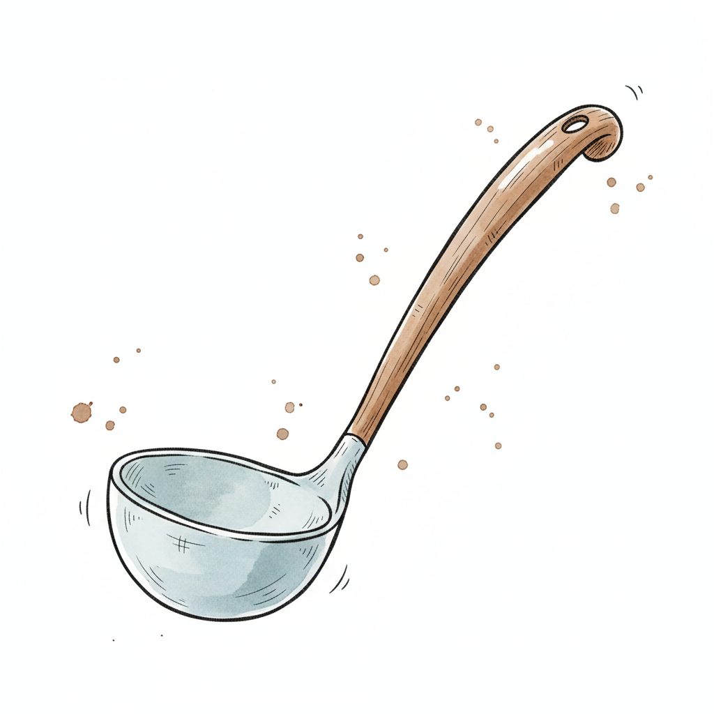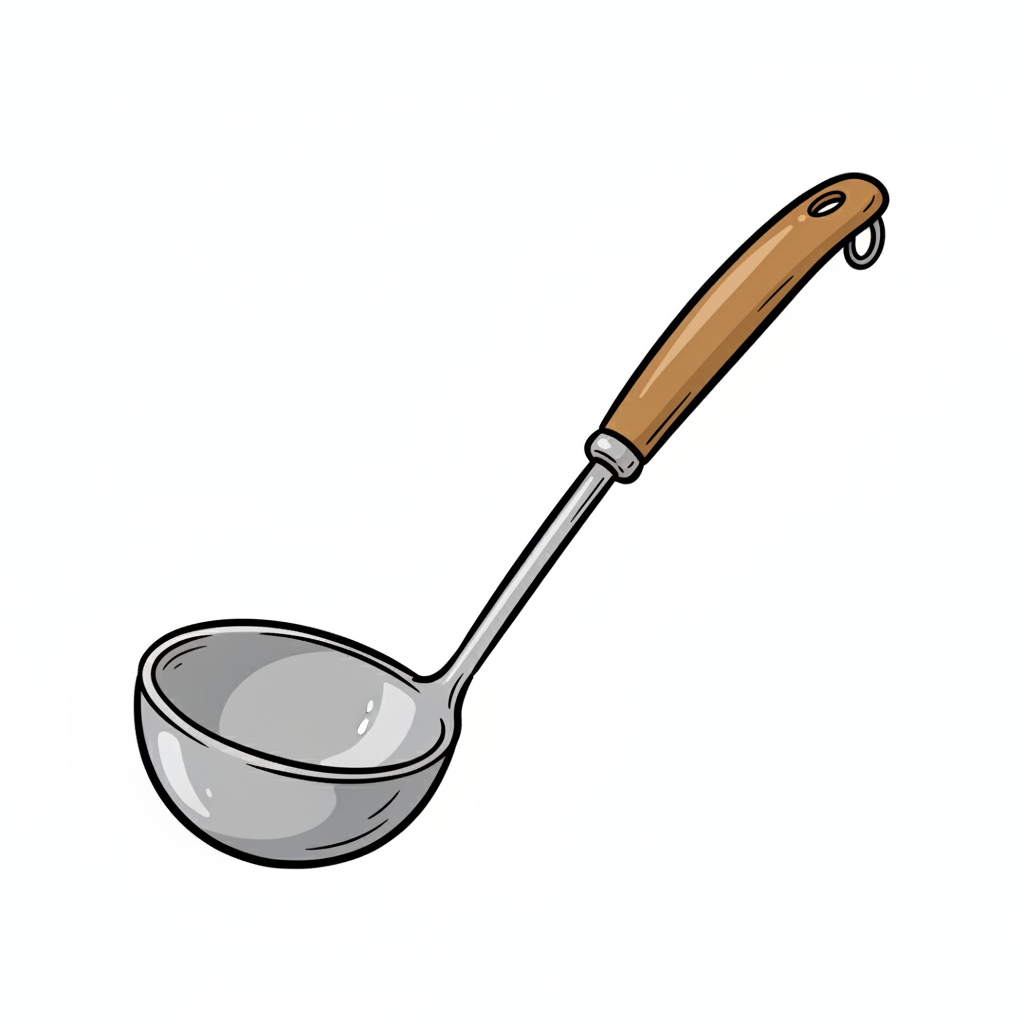 Eine gezeichnete Kelle mit einem Holzgriff und einer runden Schöpfkelle.