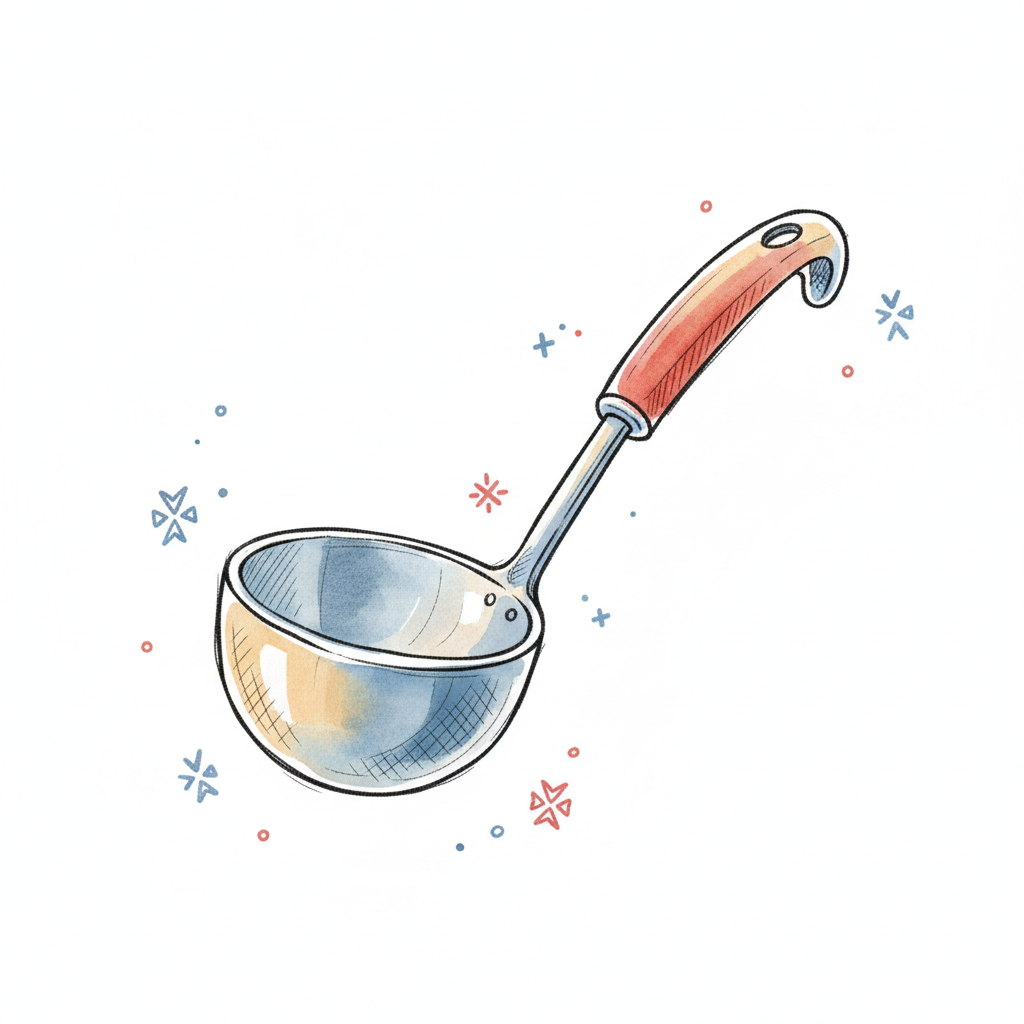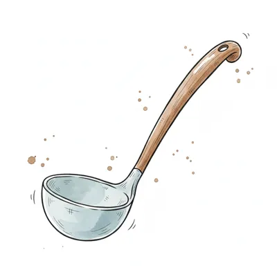 Eine einfache, stilisierte Suppenkelle in hellen Farben.