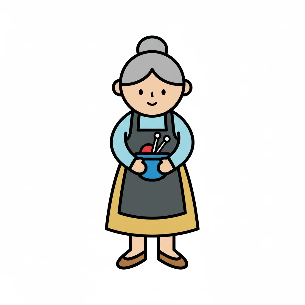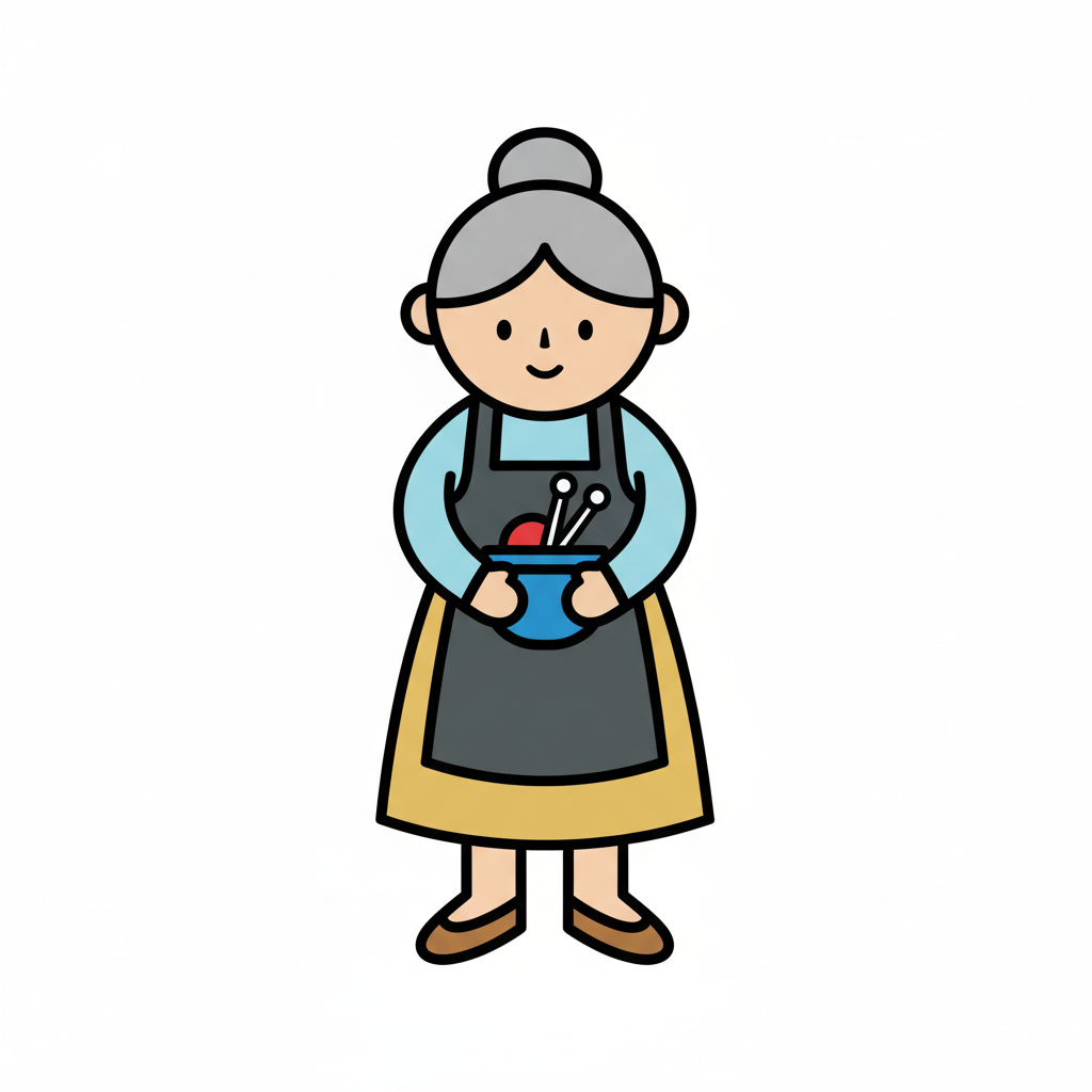 Eine ältere Frau in einem Pot mit Werkzeugen steht in einer Schürze.