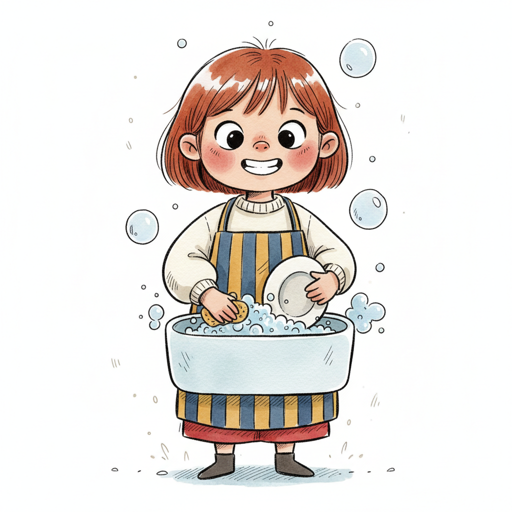 Mädchen mit Schürze wäscht Geschirr in einem Seifenblasenbehälter.