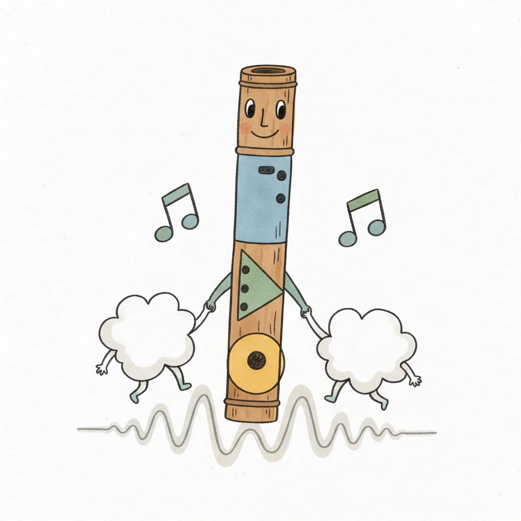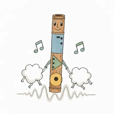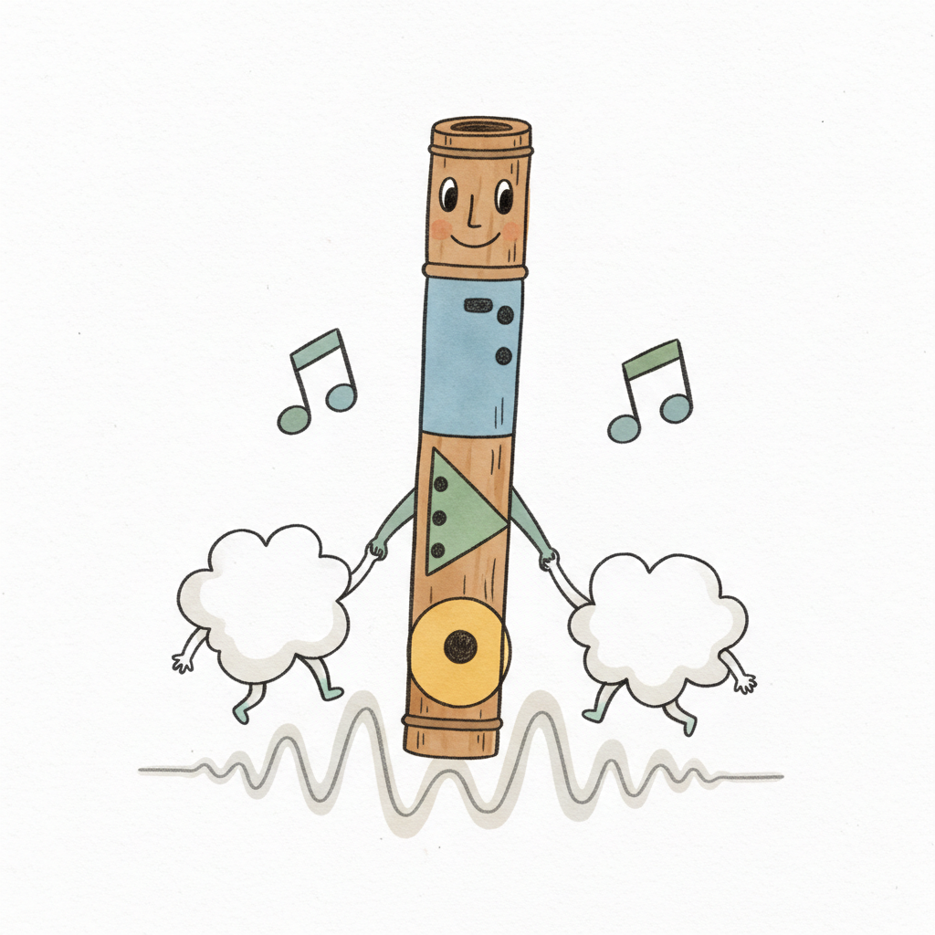 Eine lächelnde Flöte tanzt mit zwei Wolken, umgeben von Musiknoten und einer Schallwelle.