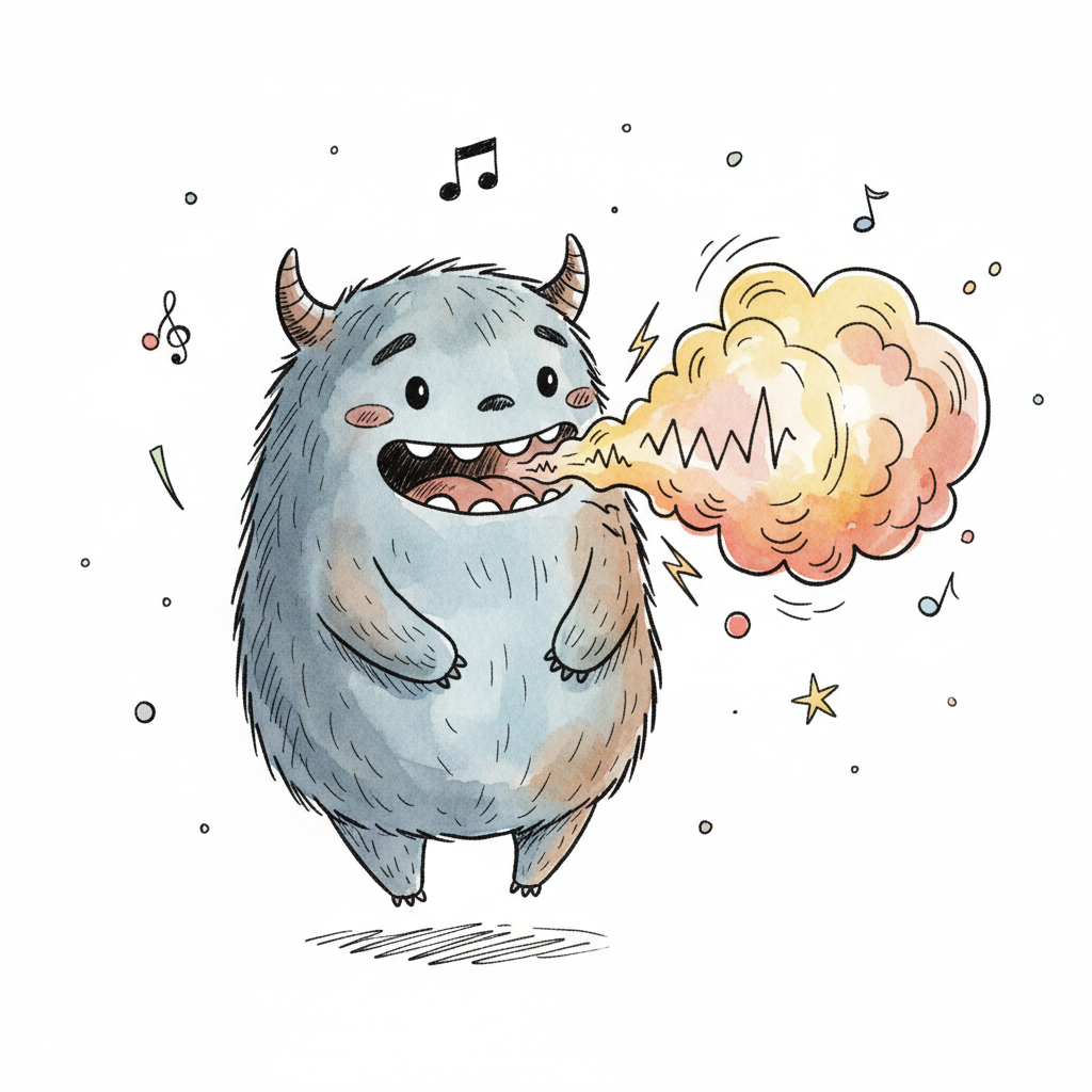 Ein süßes, gehörntes Monster mit Schallwelle aus dem Mund, umgeben von Musiknoten.