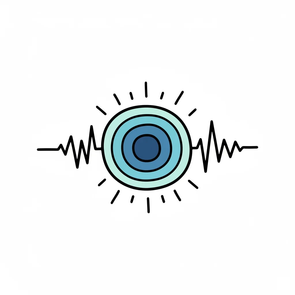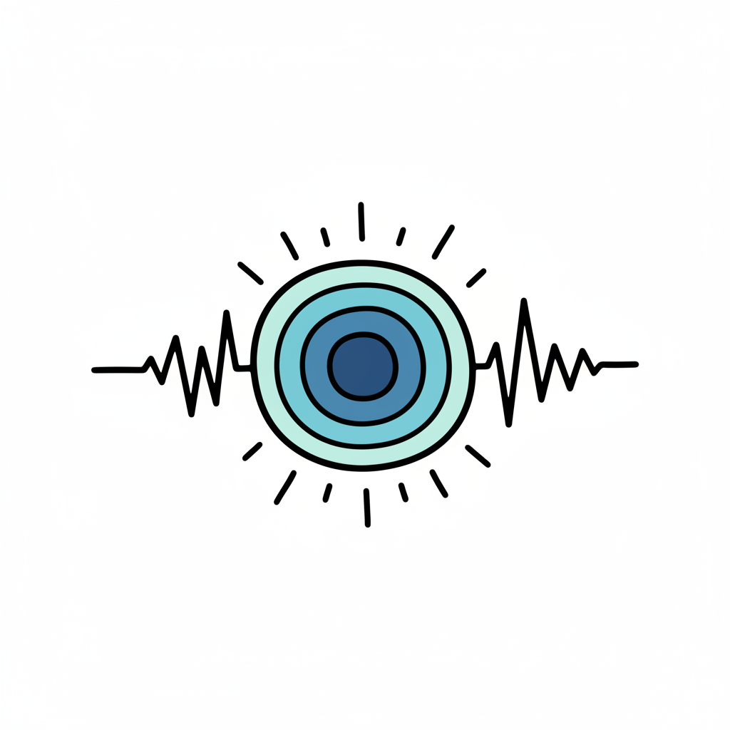 Blaues Kreissymbol mit Wellenlinien und Strahlen, das Energie oder Signal darstellt.