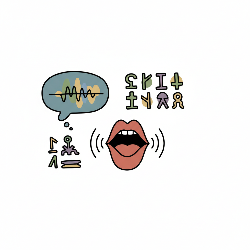 Ein Mund spricht, umgeben von Schallwellen und abstrakten Schriftzeichen.