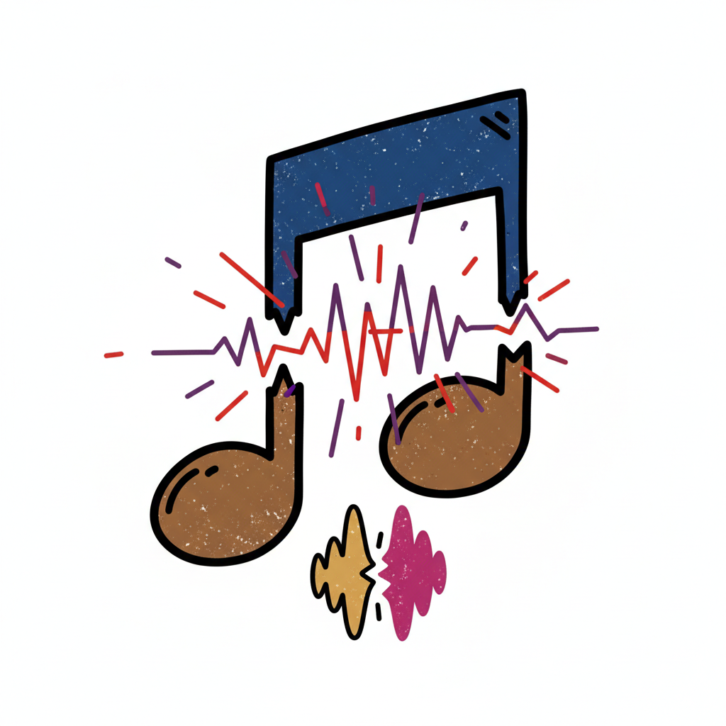 Eine zerbrochene Musiknote mit Schallwellen, die aus der Bruchstelle austreten.