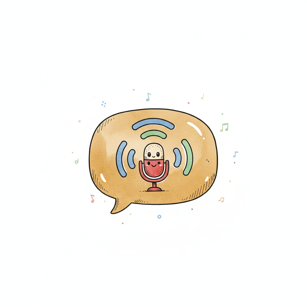 Niedliches Cartoon-Mikrofon in Sprechblase mit Schallwellen und Musiknoten.