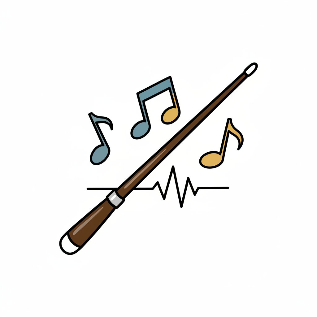 Dirigentenstab mit Musiknoten und Schallwellen als farbige Illustration.