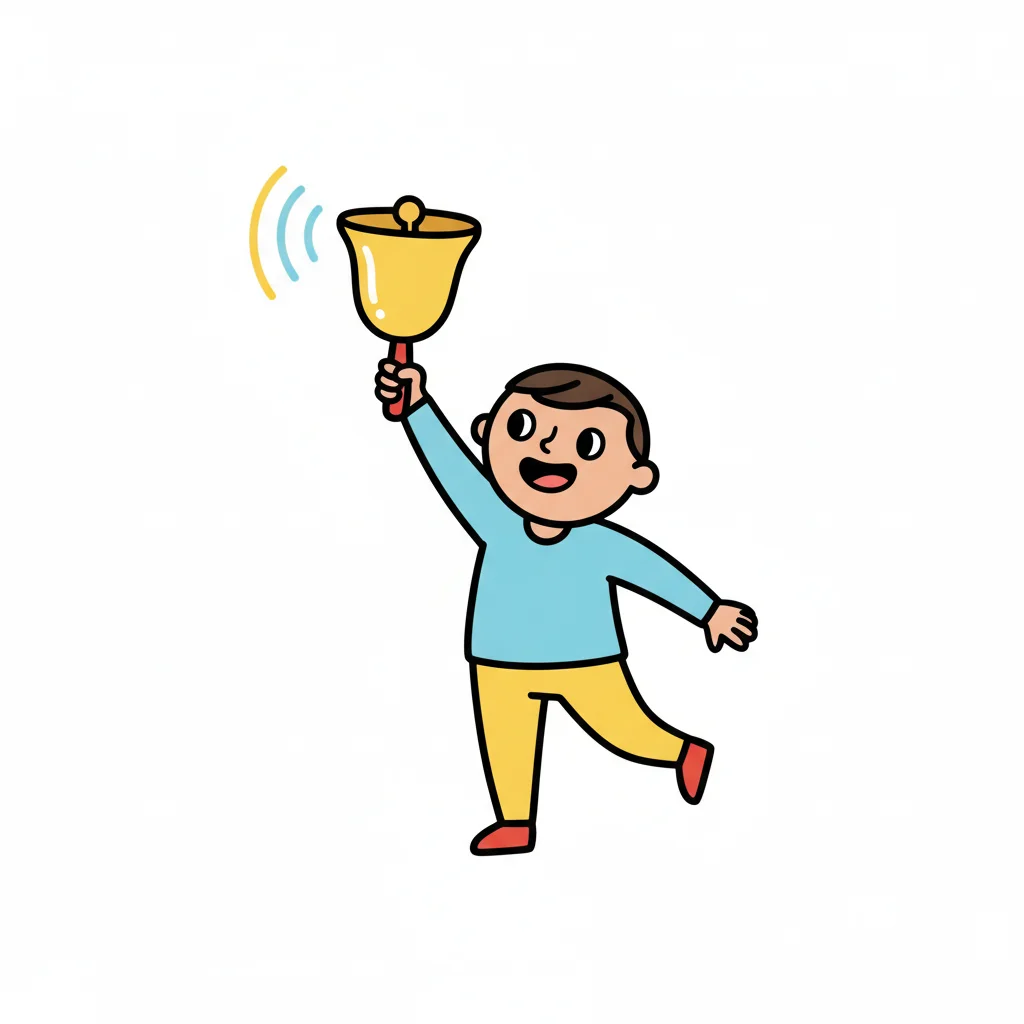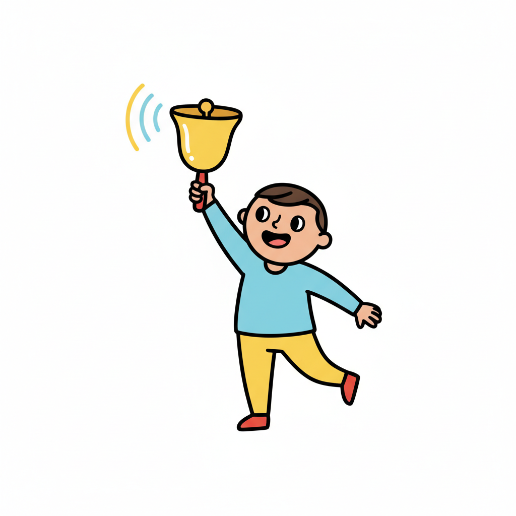 Ein fröhlicher Cartoon-Junge läutet eine goldene Glocke, von der Schallwellen ausgehen.