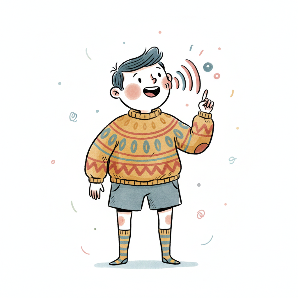 Fröhlicher Cartoon-Junge spricht mit erhobenem Finger, Schallwellen symbolisieren Sprache.