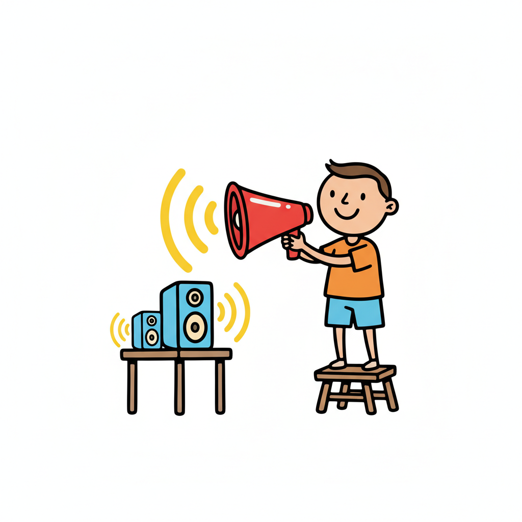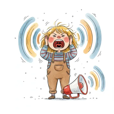 Wütendes Kind schreit laut, Hände auf Ohren, Megafon am Boden, Schallwellen symbolisieren Lärm.